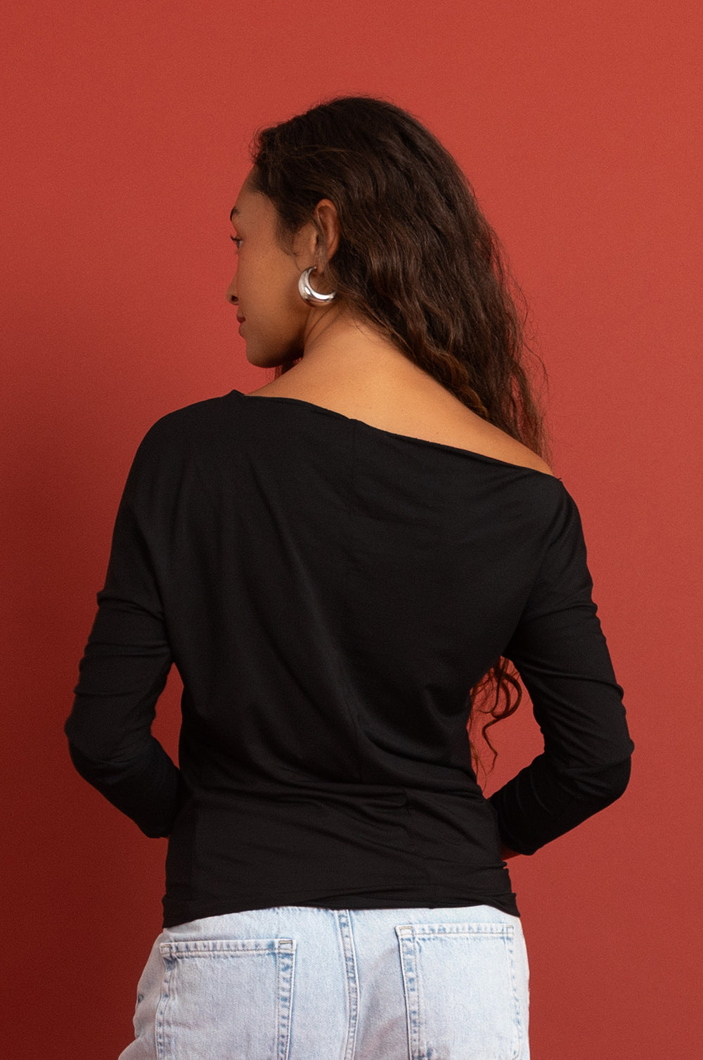 An easy off-the-shoulder staple with cuffed ¾ sleeves and endless pairing potential.