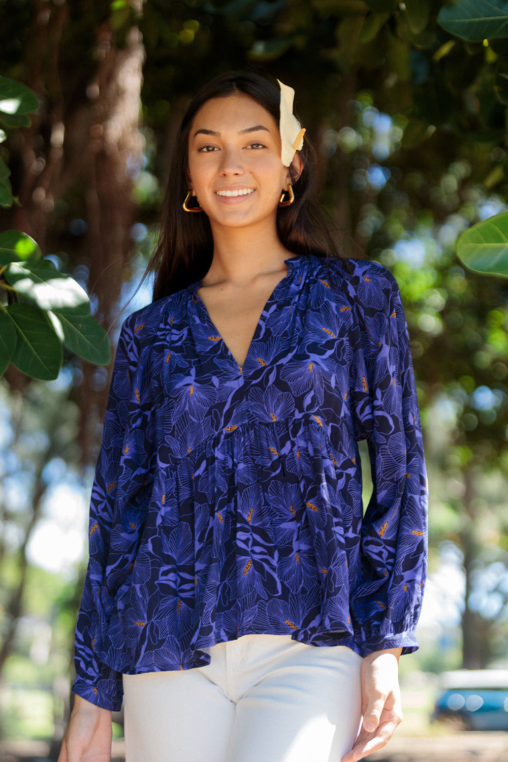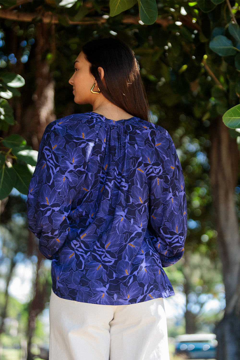 long sleeve blouse, cuffed poof sleeve, gathered waist, collar band, v neck line