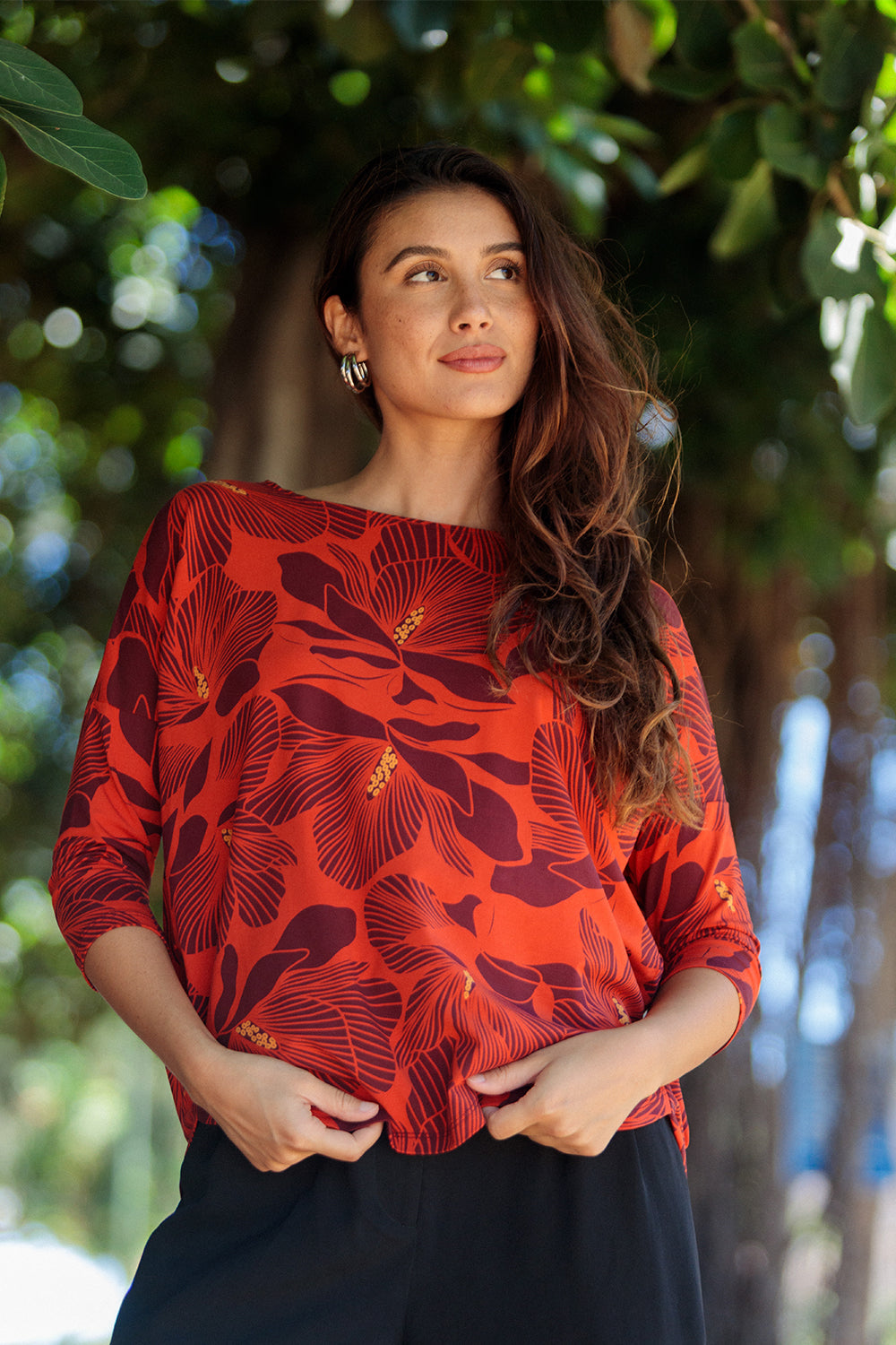 A classic boat neckline top with fitted sleeves and a curved hem.
