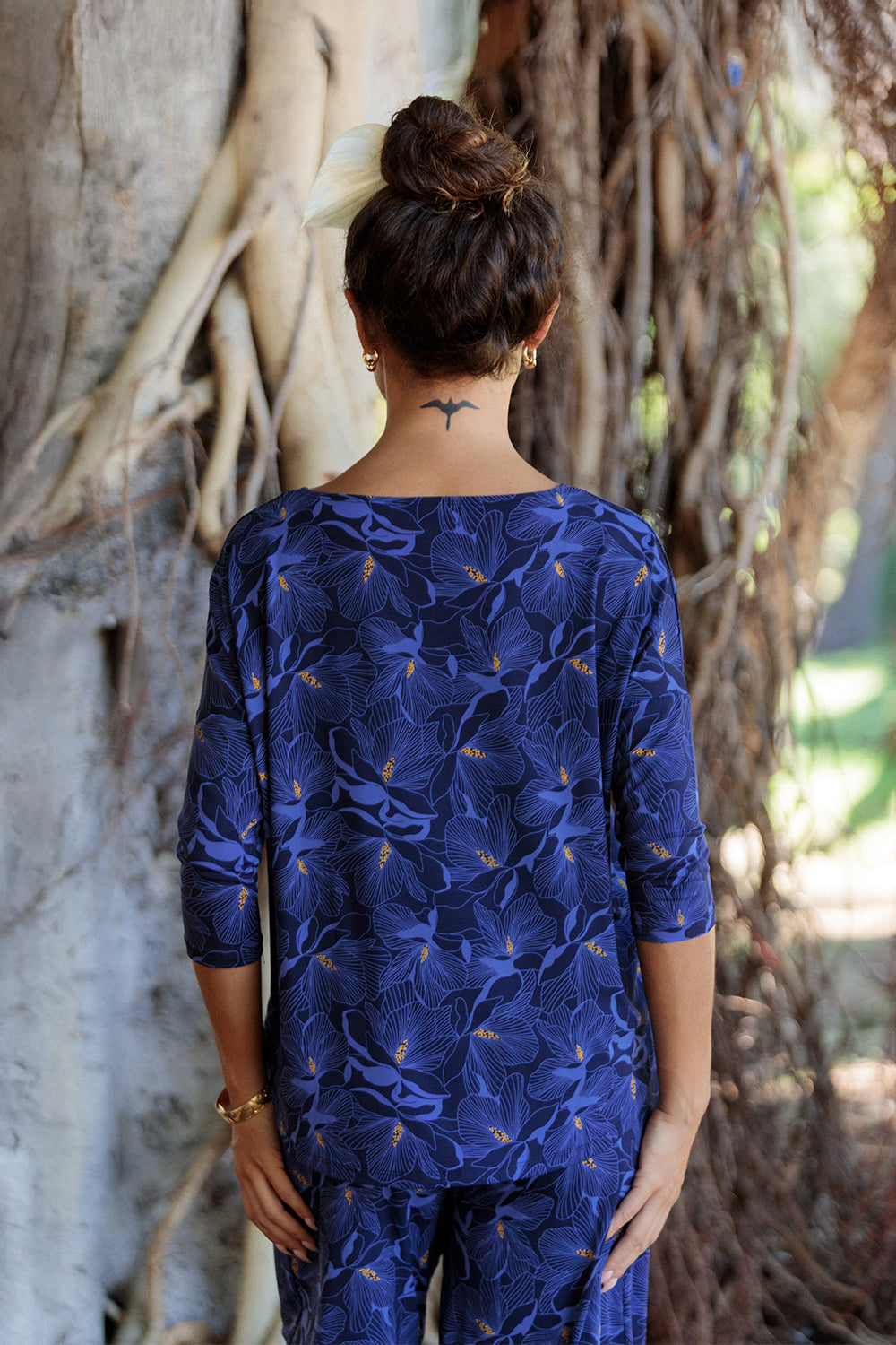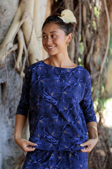 A classic boat neckline top with fitted sleeves and a curved hem.