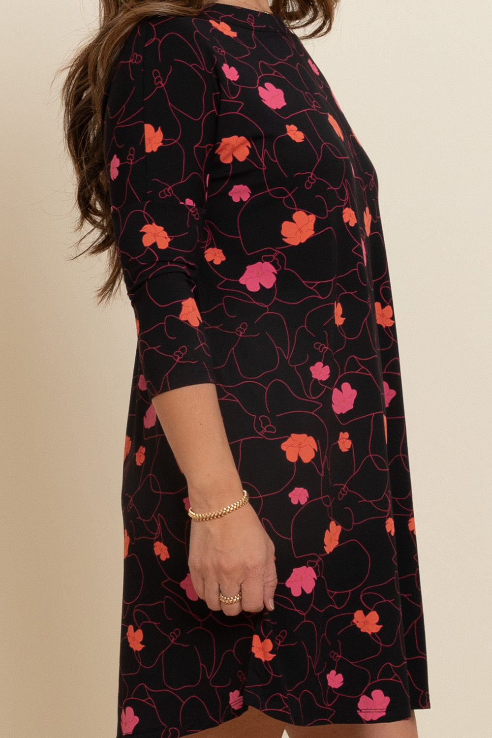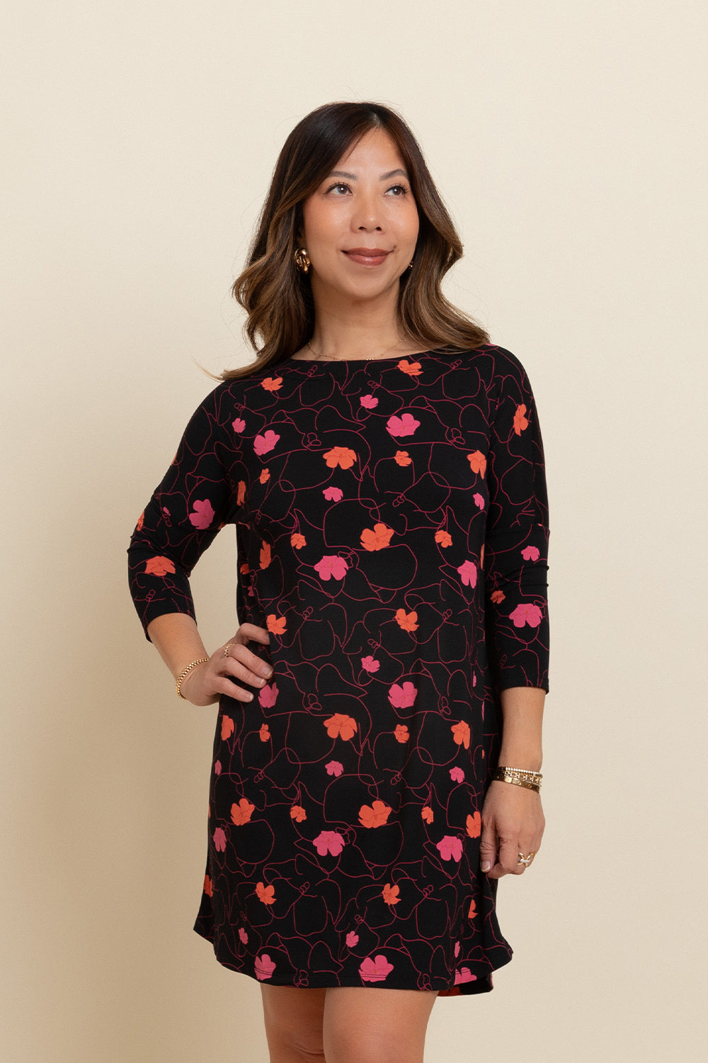 A classic straight body dress, 3/4 sleeves and topstitch facing detail at neckline.