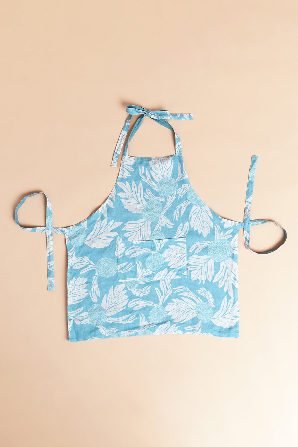 This linen apron is a bib-style, mid-thigh length with handy front pockets and tie straps at the neck and waist.