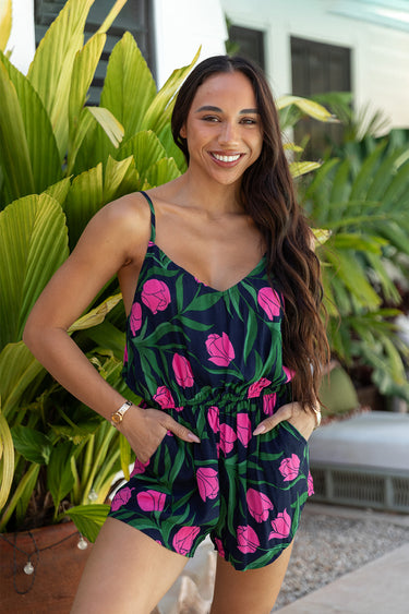 A staple for your closet. Easily transition from day to a casual night out. This little number features an elastic at waist, adjustable tie spaghetti straps, and pockets.