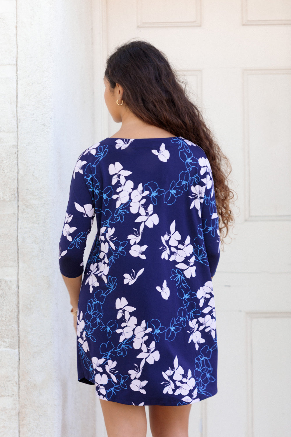 A classic straight body dress, 3/4 sleeves and topstitch facing detail at neckline.