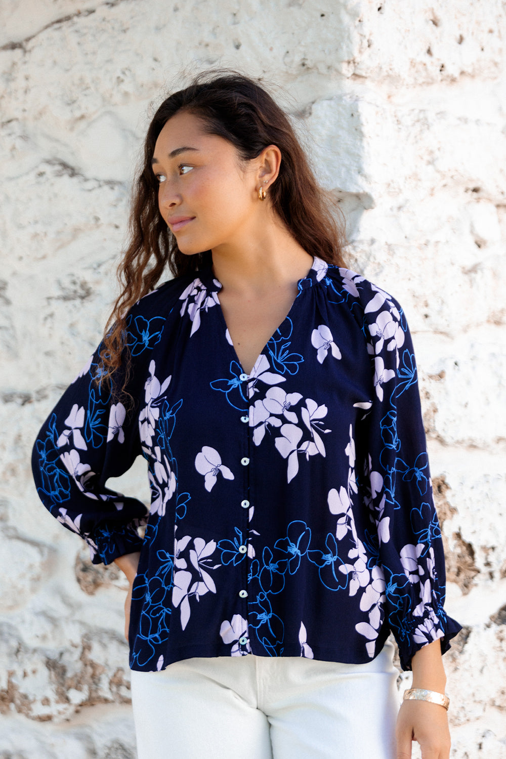 Boho-inspired and effortlessly chic, Top Marrakech features a button-down design with full-length sleeves and elastic at the wrist for a relaxed fit. The V-neckline adds a flattering touch, making this peasant top perfect for layering or wearing on its own for a laid-back, stylish look.