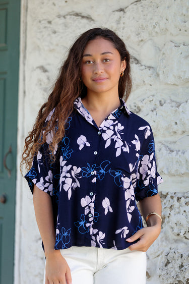 A button up top featuring a boxy/flowy fit, chest pocket, and cuffed sleeves