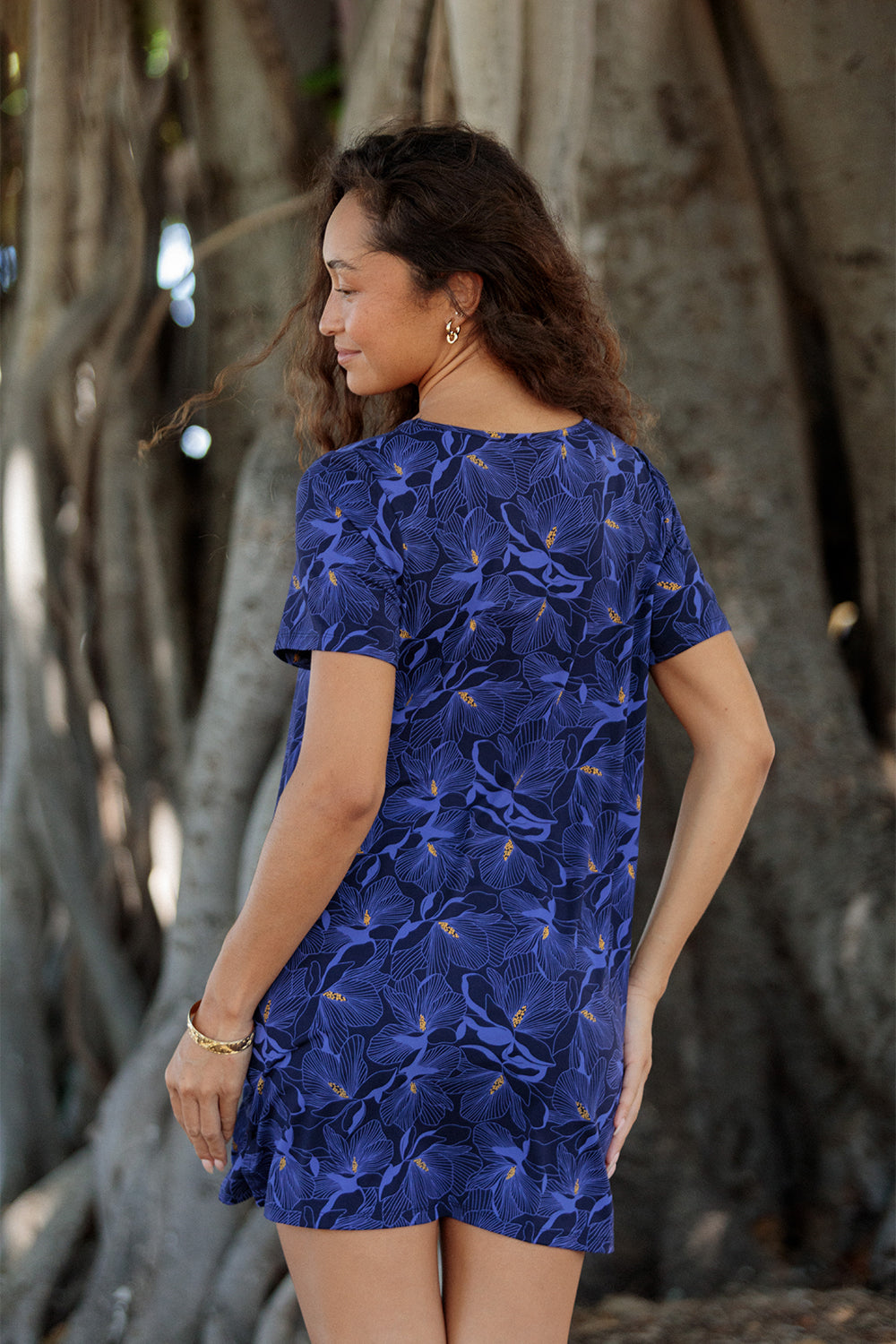 Short Length T-shirt style dress, with short sleeves, "V" neckline at the front, and small side slits at side seams.