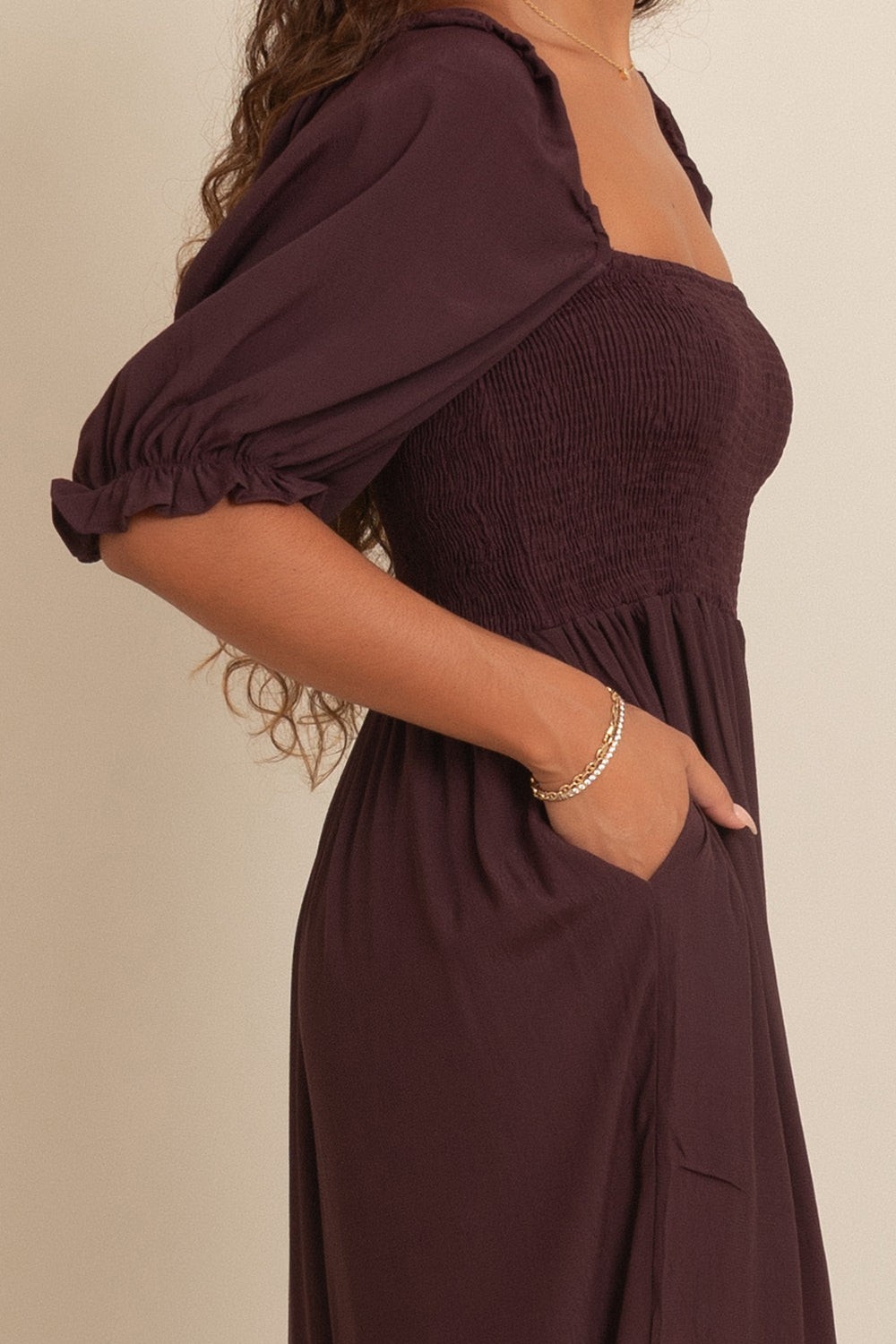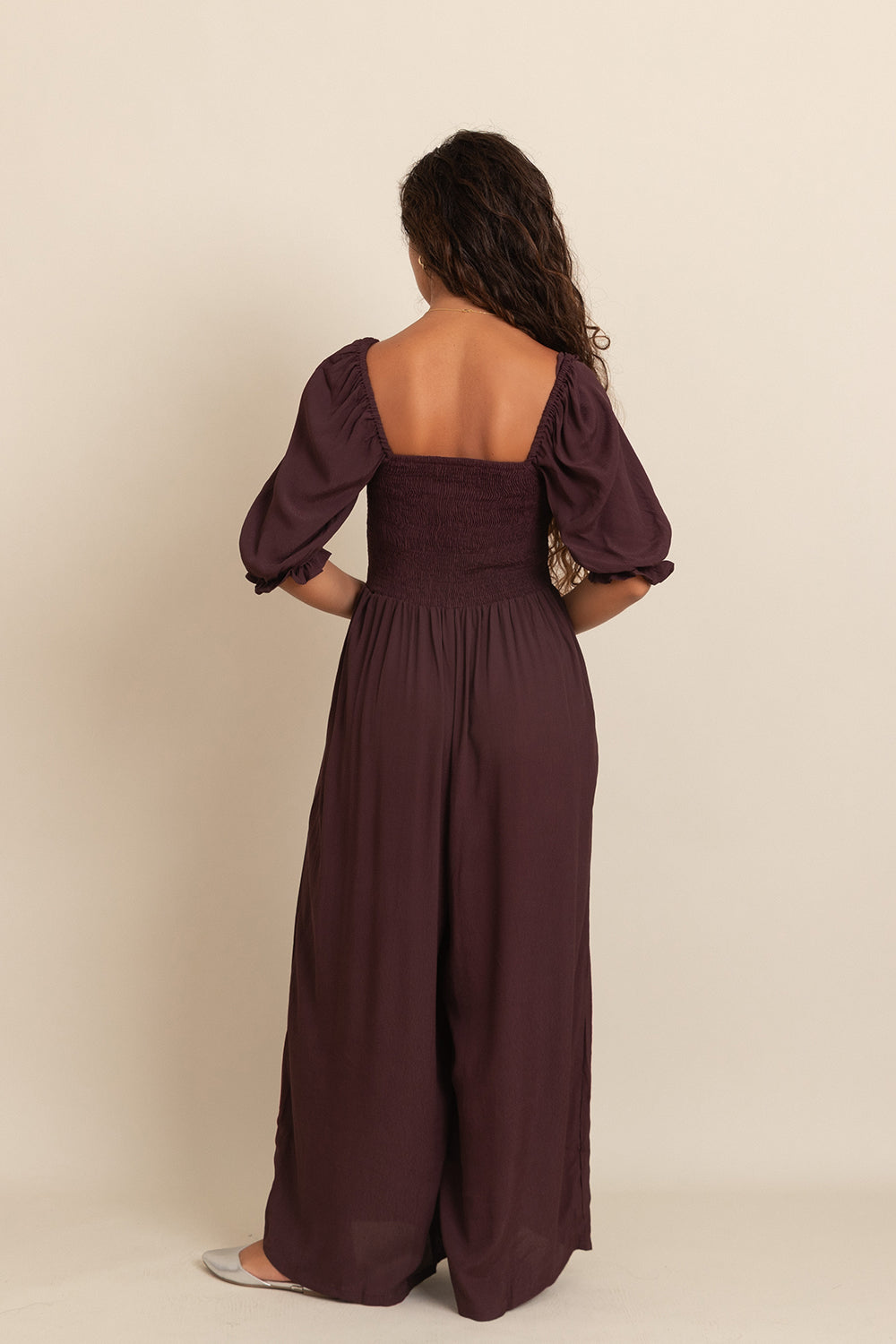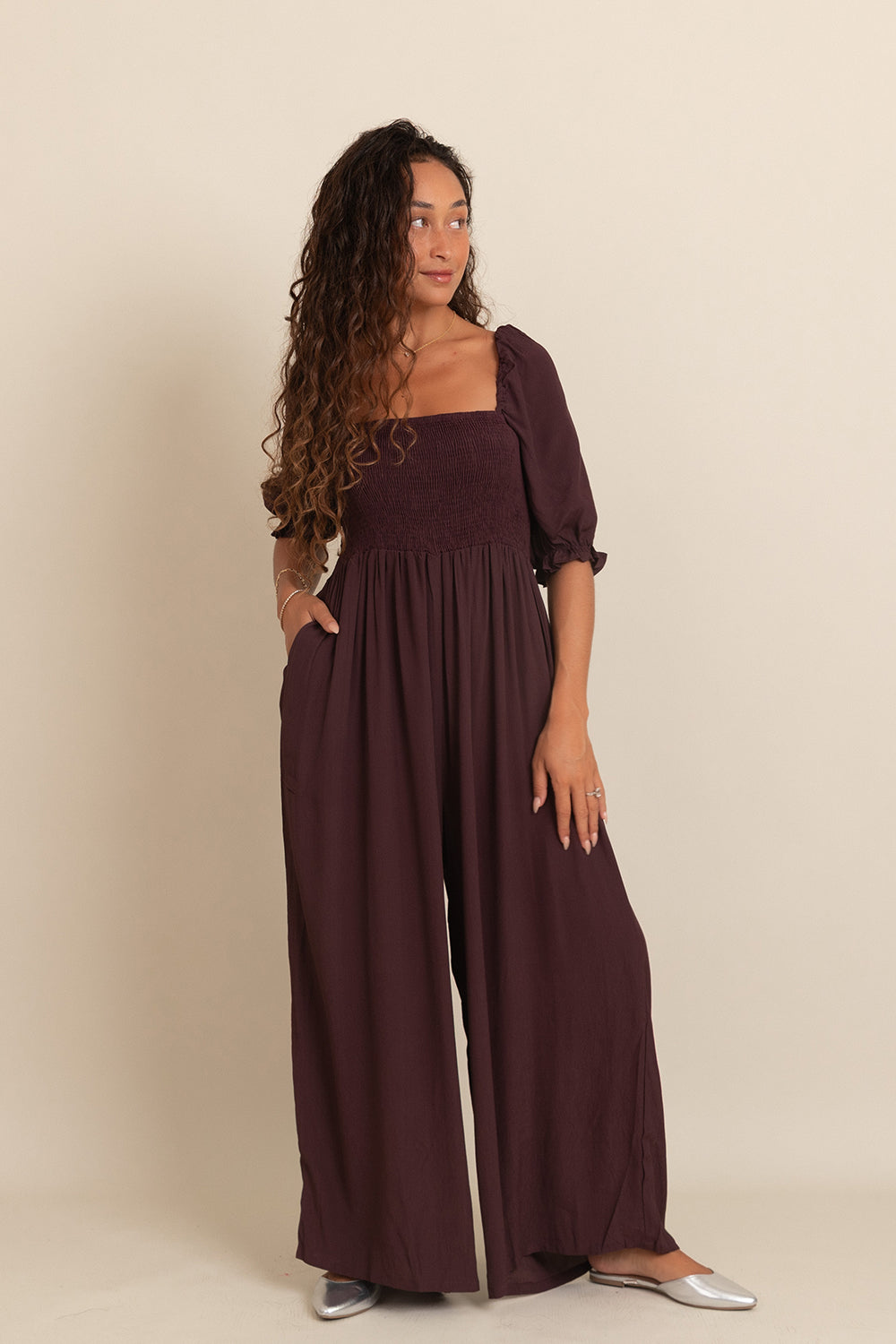 A jumper that features wide flowy pants, pockets, puff sleeves with elastic at shoulders.