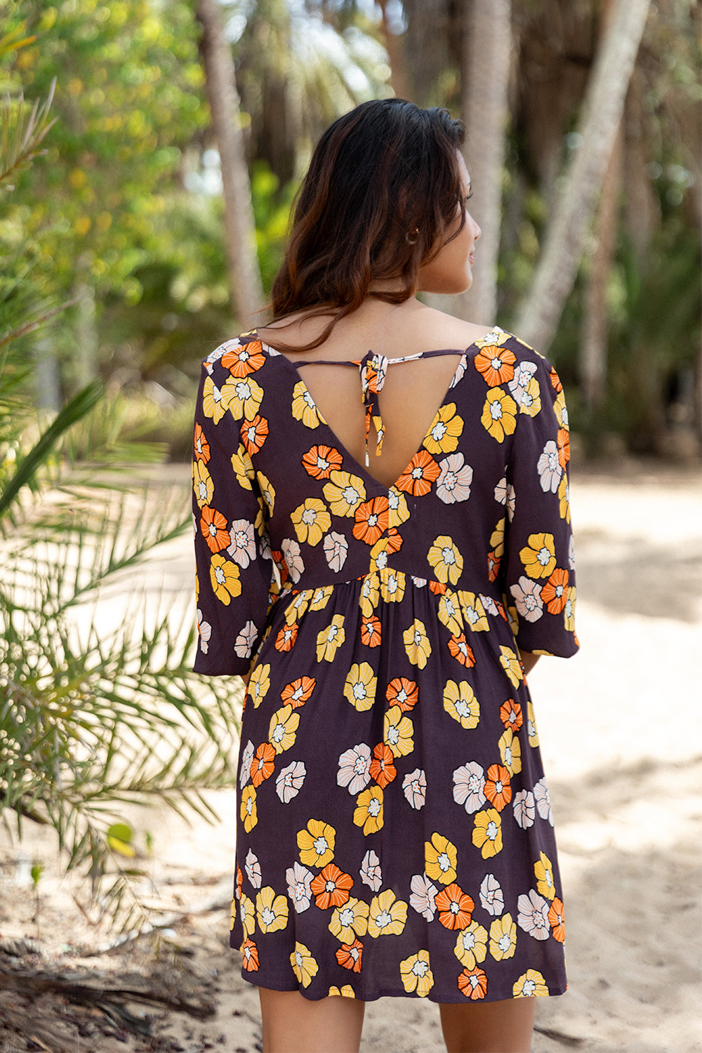Dress Reno features an A-line fit with an adjustable tie-back that cinches the waist for a custom look. The empire waist adds definition, while the flowy 3/4 sleeves offer a relaxed, elegant touch, making this dress perfect for both casual and dressy occasions.