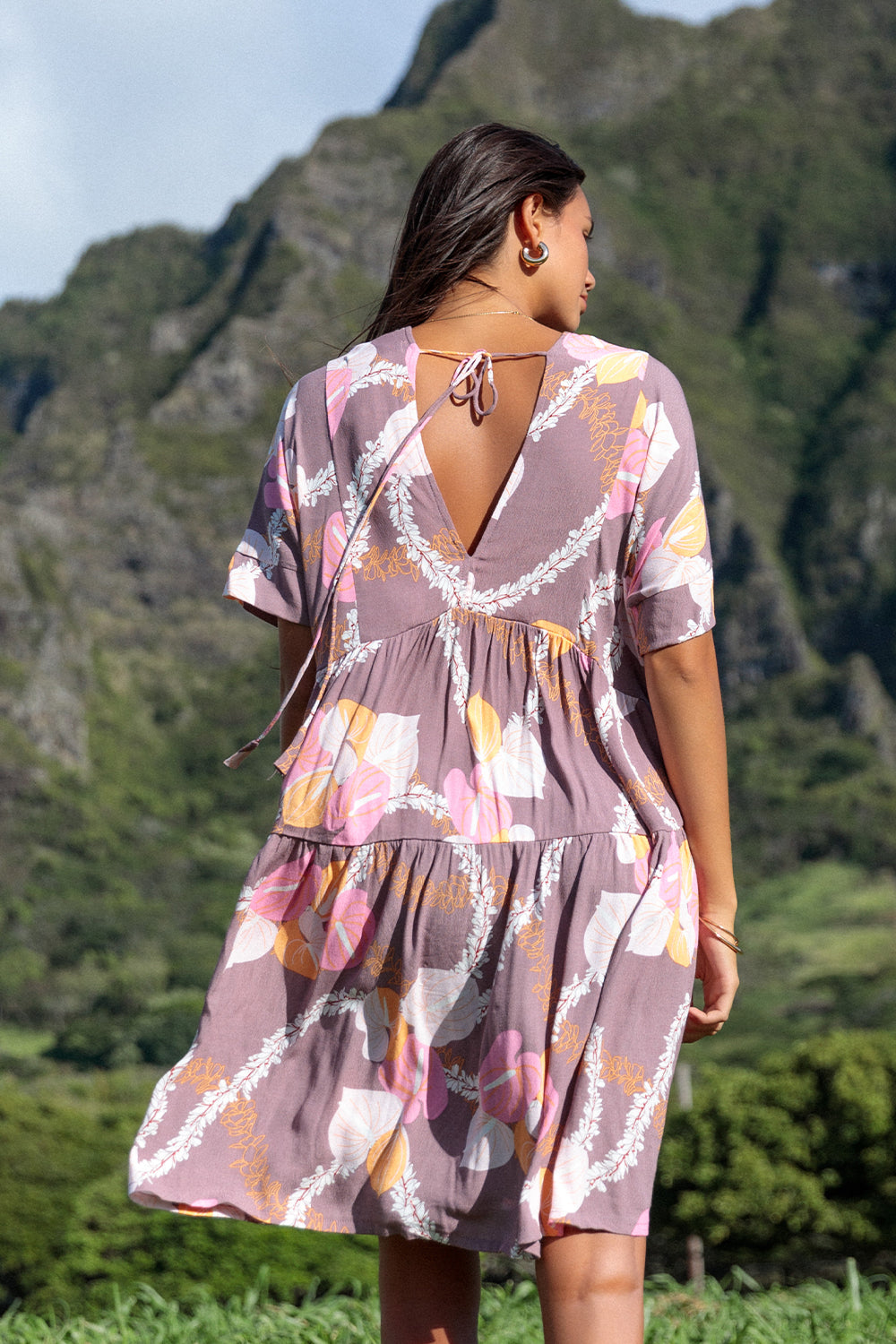 Fun and flirty, this tiered babydoll dress features a v neckline and tie detail at back.