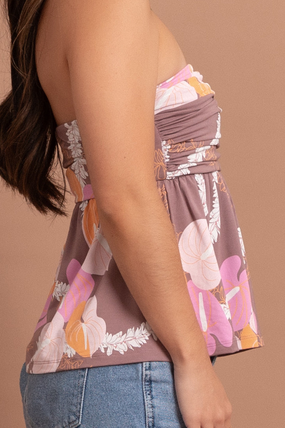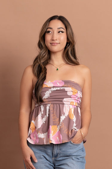 A babydoll style strapless top with fun ruching detail.