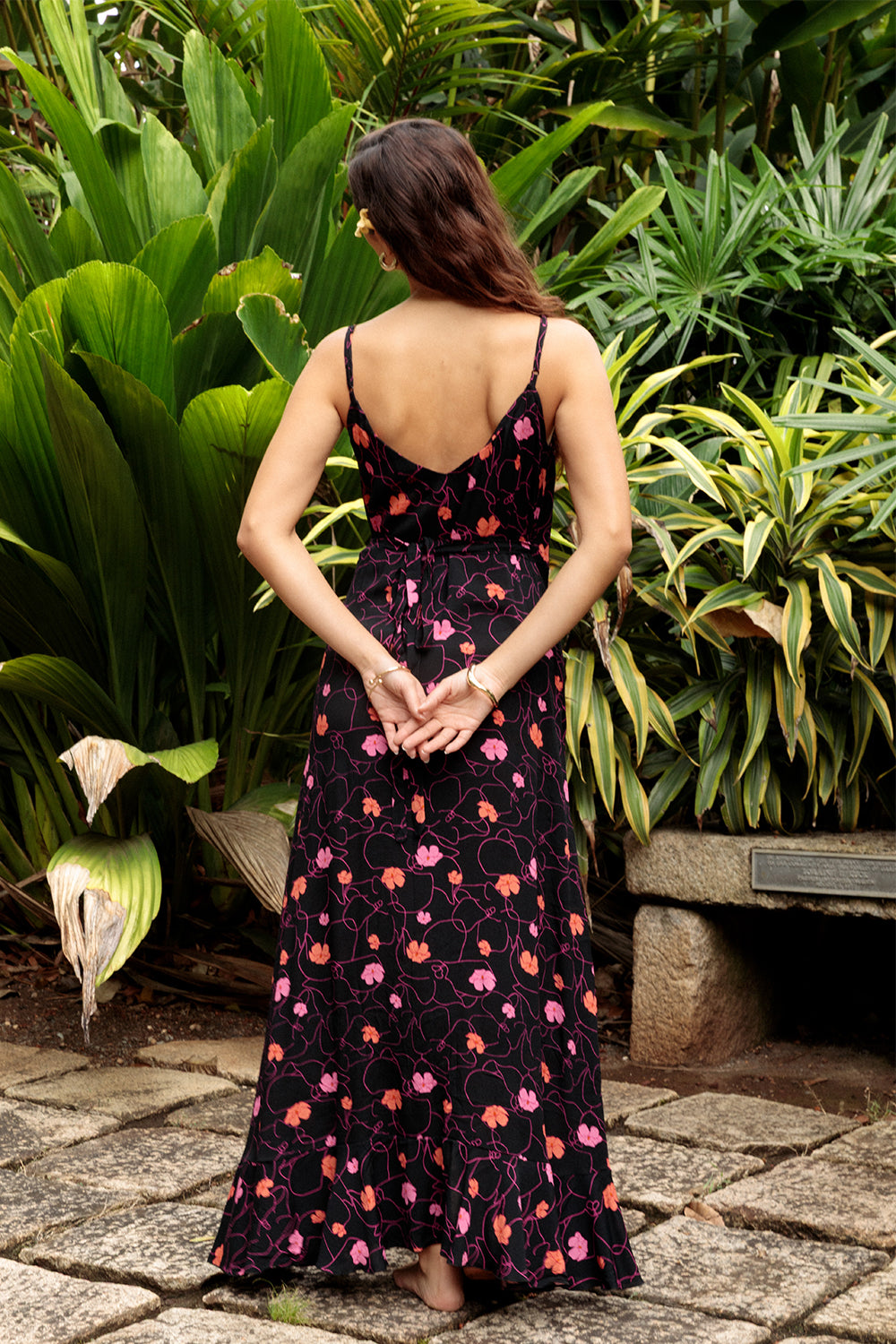 Dress Linh is a maxi dress featuring adjustable spaghetti straps and a flattering surplice V-neckline. It has a high-low ruffled hemline for movement and has pockets.