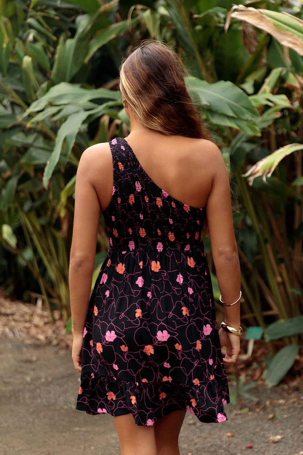 A woven mini dress with a comfortable, smocked bodice and a trendy one-shoulder neckline.