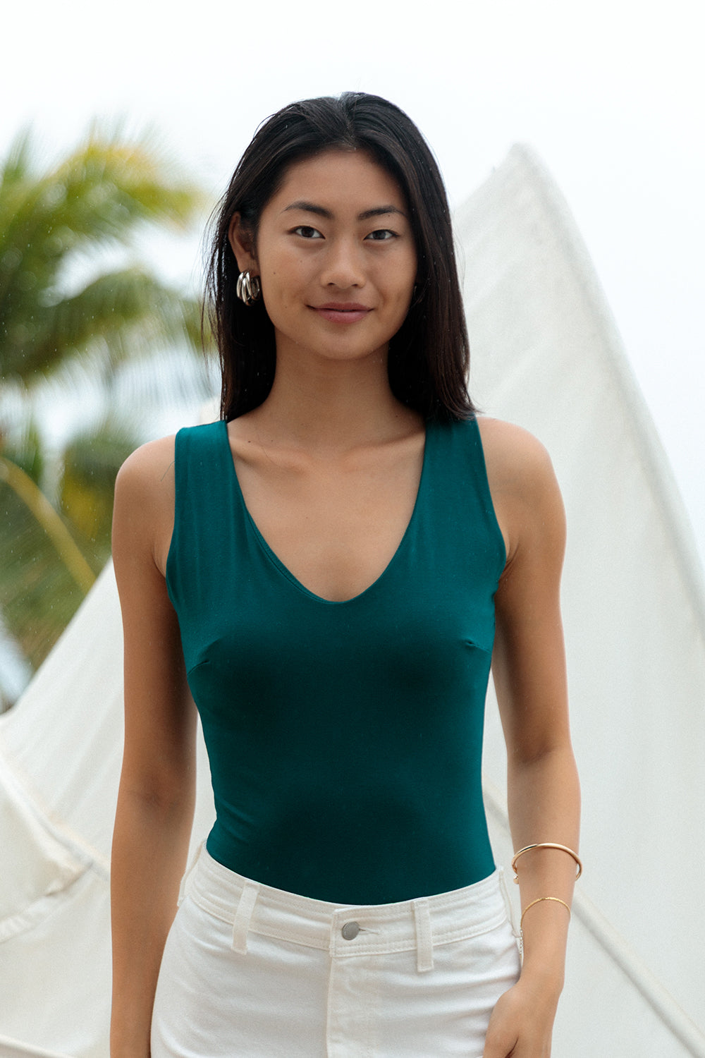 A sleek, sleeveless bodysuit with a classic scoop neckline and a minimal thong cut for a smooth, no-show fit. perfect for layering or wearing on its own.