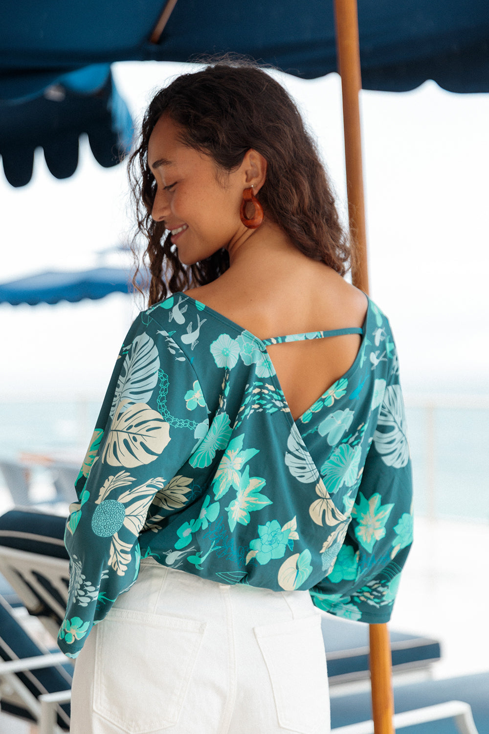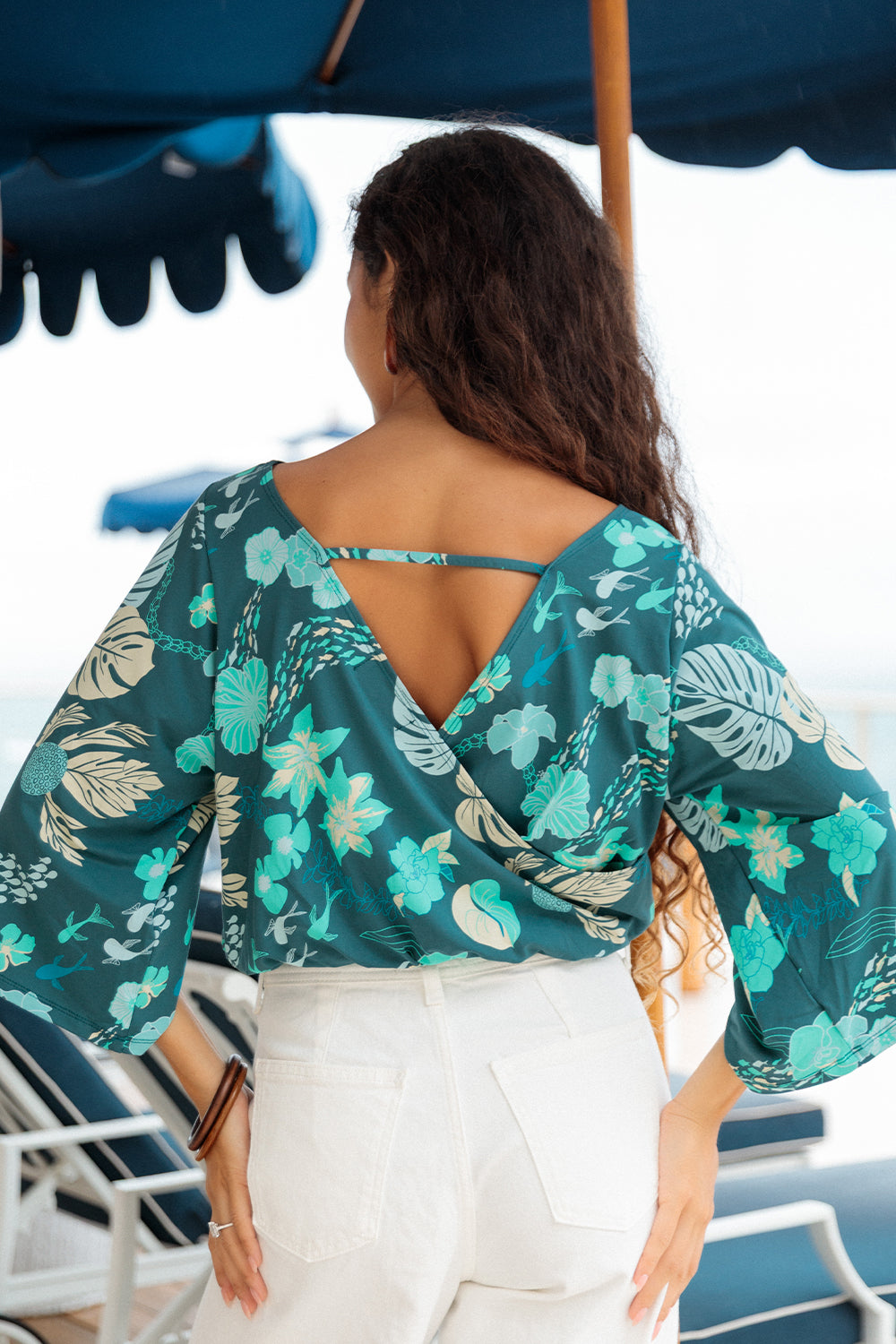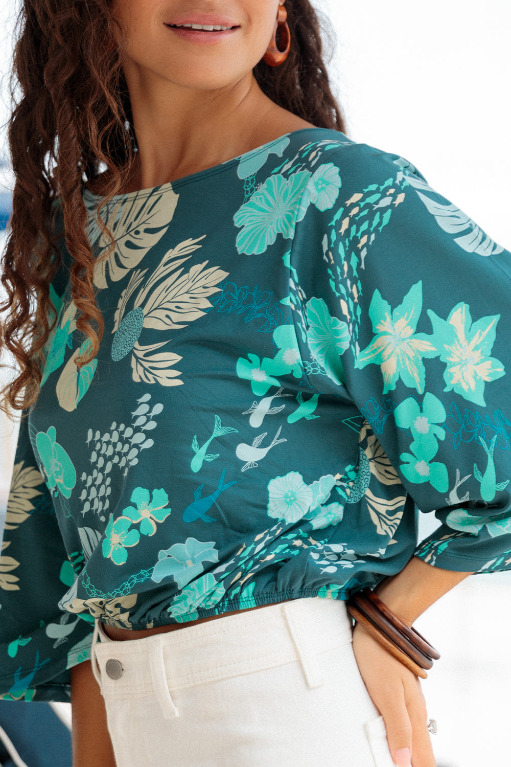 Boat neckline top with elastic waistband, wide 3/4 sleeves and crossover back detail with elastic to hold in place.