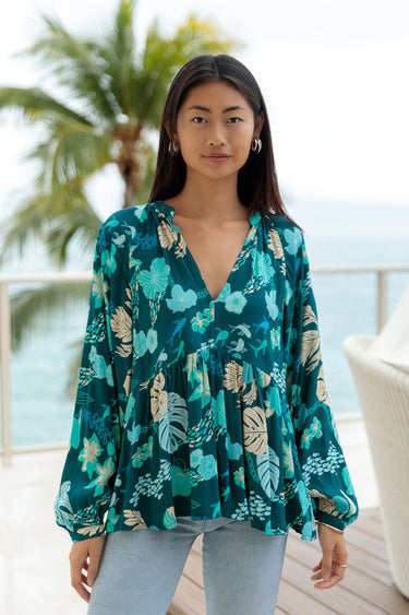 long sleeve blouse, cuffed poof sleeve, gathered waist, collar band, v neck line