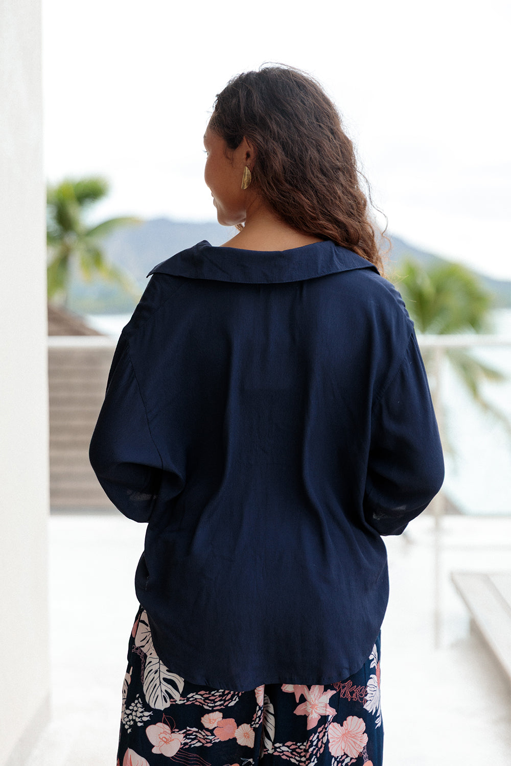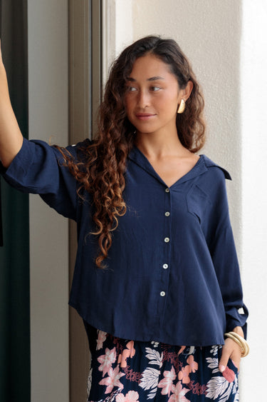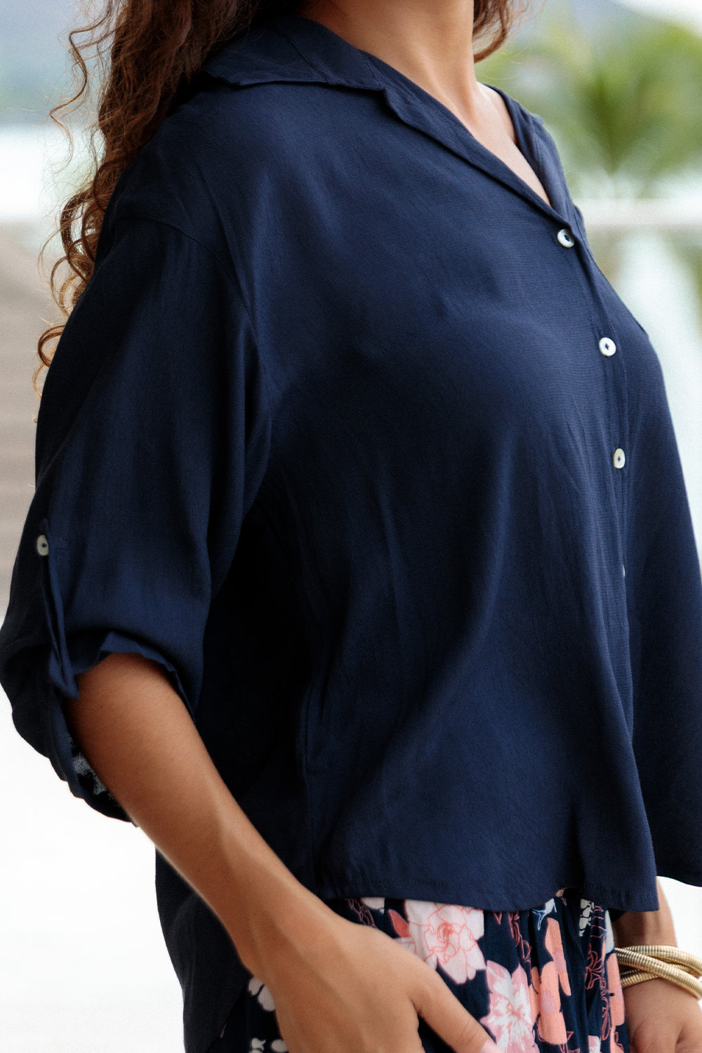 Our take on a classic button up. Top Tiani features a loose fit, tabs at sleeves to roll it up, and a curved hem.