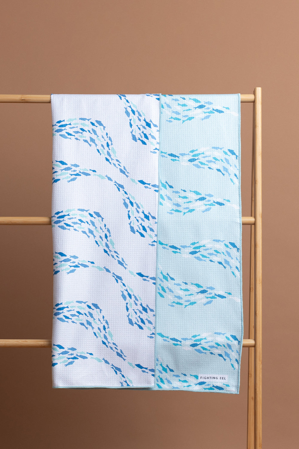 - Each towel comes in a reversible design and comes with a matching drawstring pouch