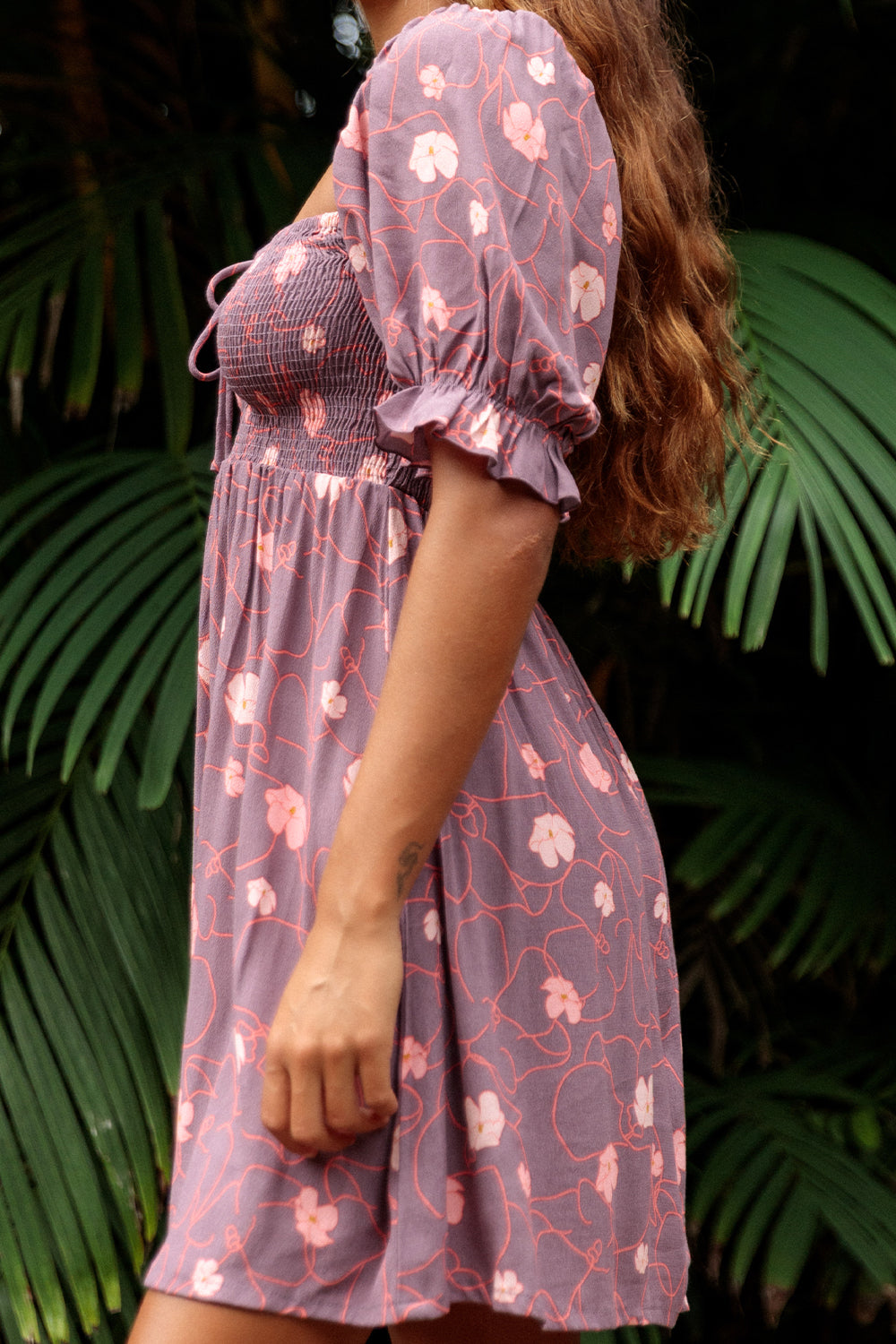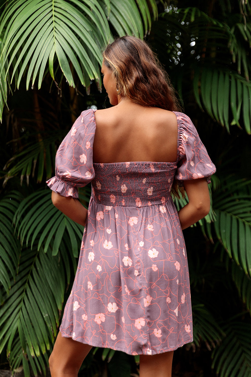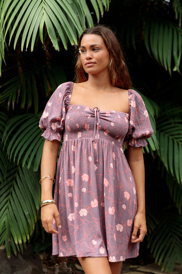 Mini dress with a flattering square neckline, smocked bodice detail, and charming short puff sleeves.