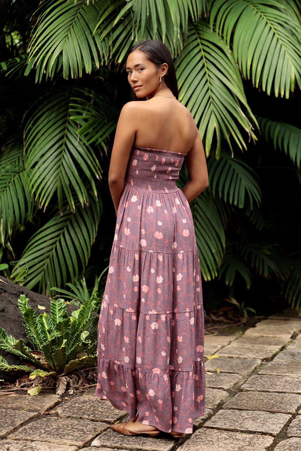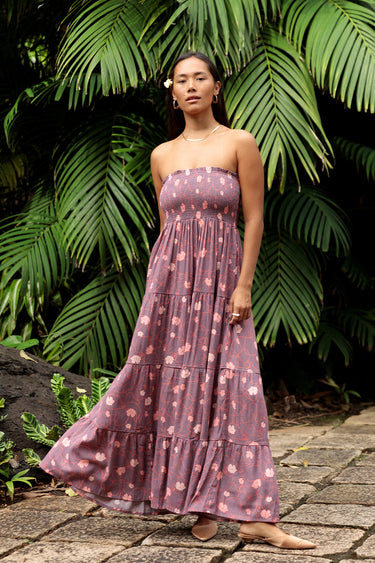 A maxi dress featuring a strapless, smocked bodice for a comfortable fit and a flowing, tiered skirt.