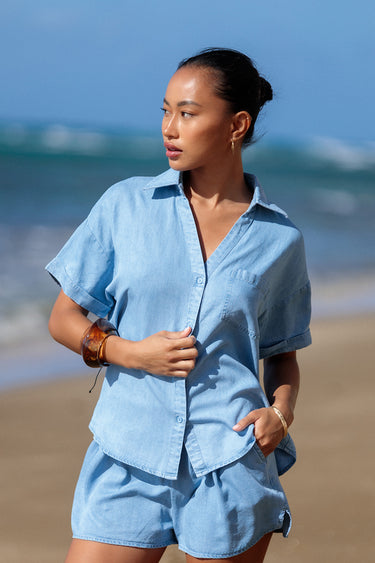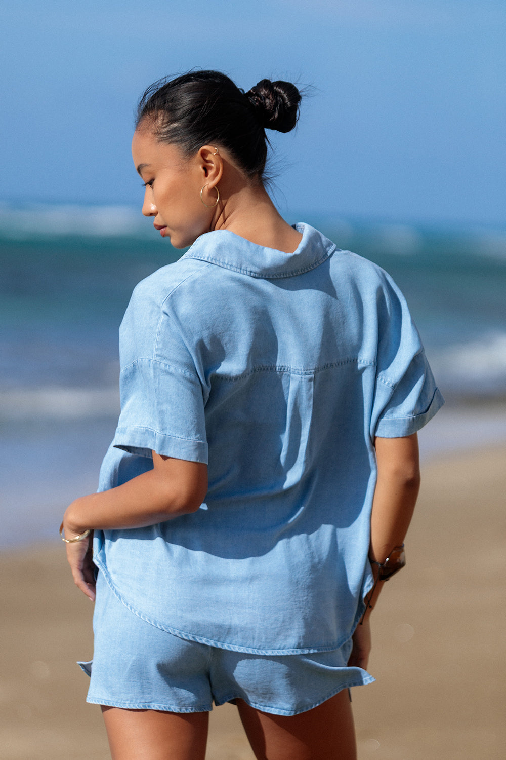 Shirt Dakota features a classic collared V-neckline, a full button-front, and short sleeves. Adding to its casual charm is a front pocket located near the chest.