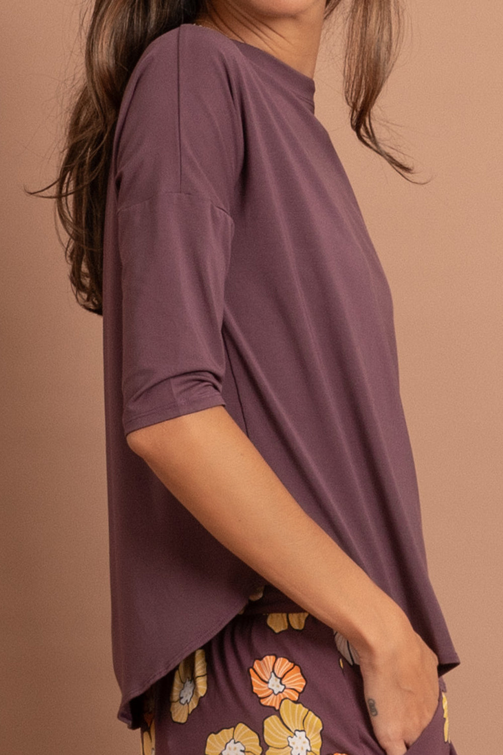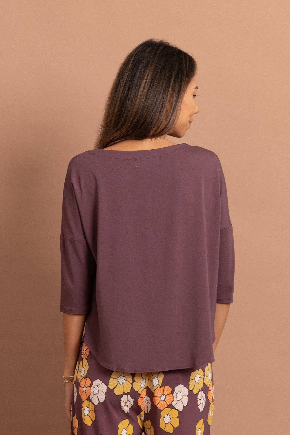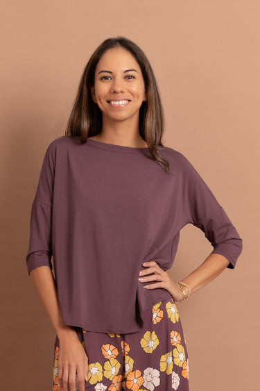 A 3/4 sleeve top that features a topstitched neckline detail.