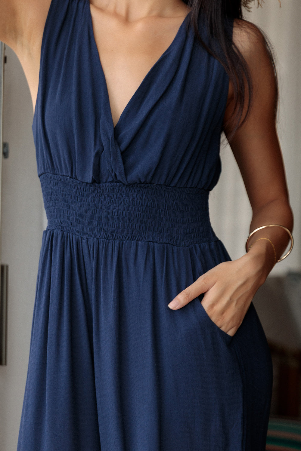 Cropped wide leg pant, button closure at back, smocking at waist, overlapping V neck at front.