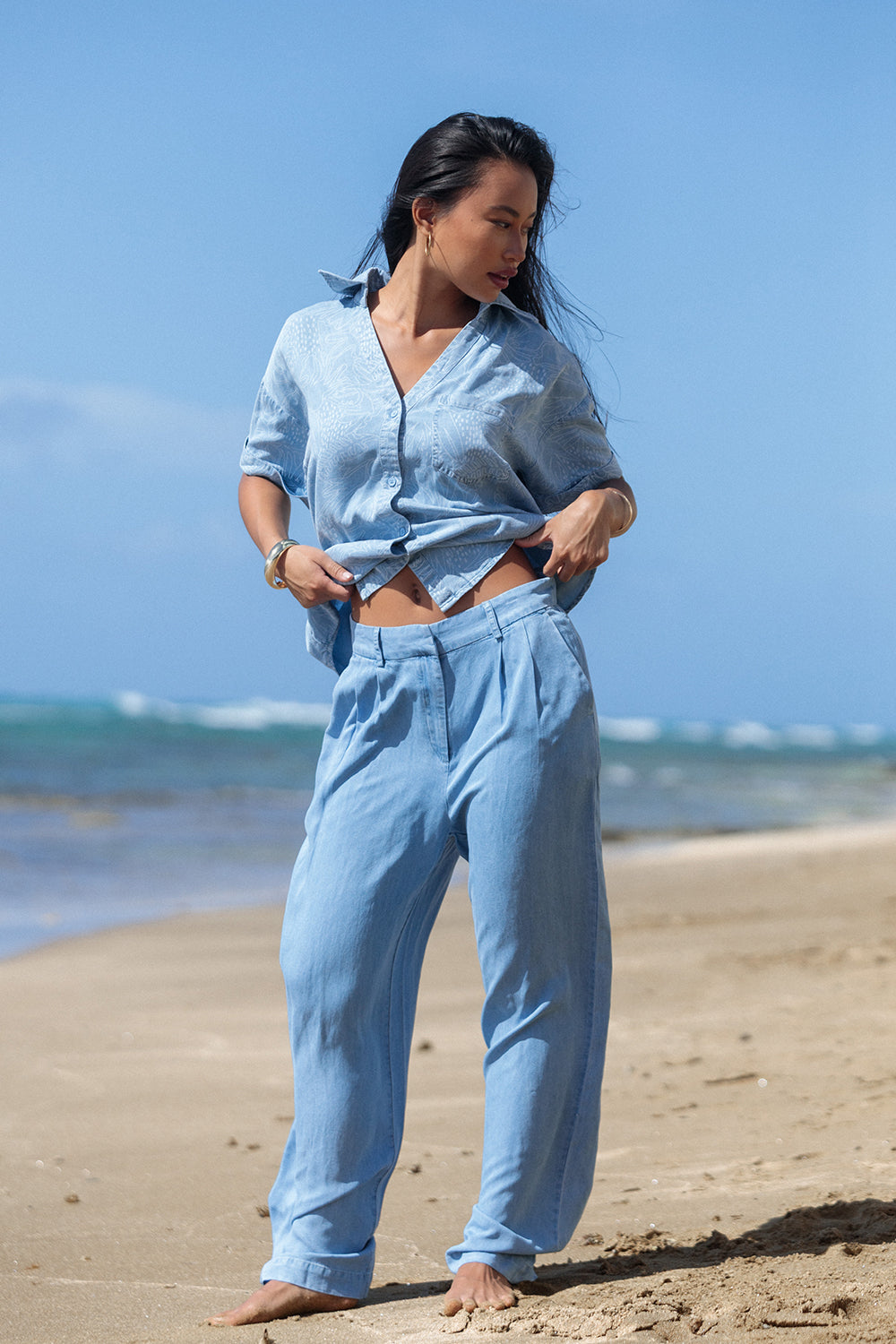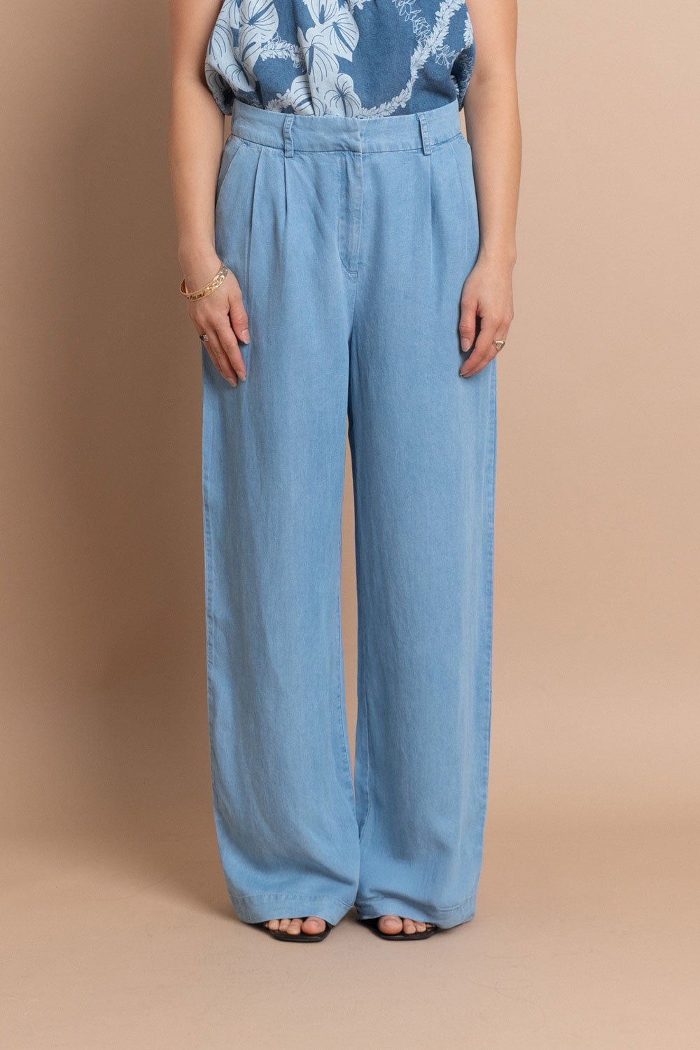These wide-leg trousers are made from breezy Chambray Lyocell, giving them a beautiful drape and comfortable feel. Featuring a high-waisted fit and flattering front pleats, they offer a relaxed yet polished look.