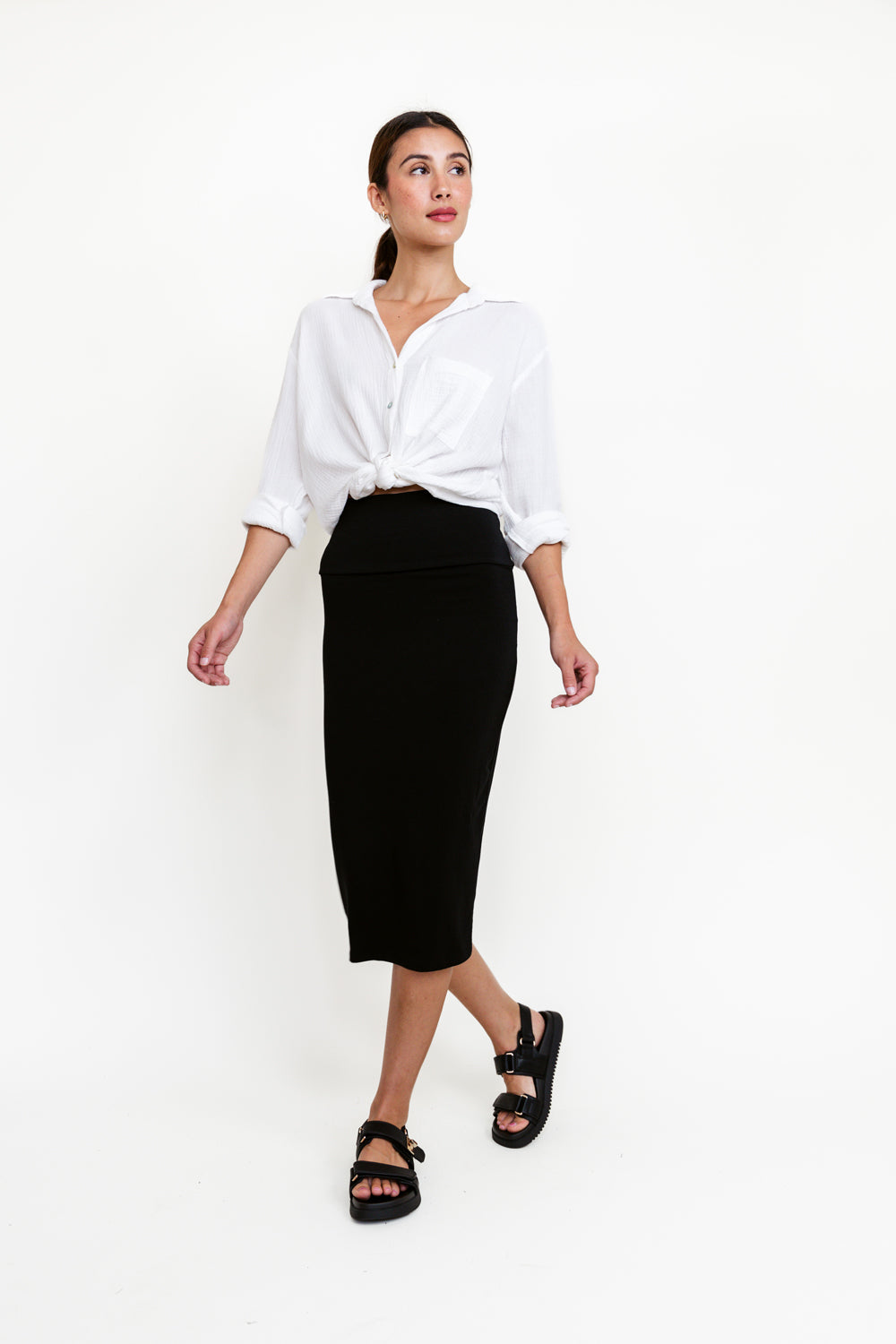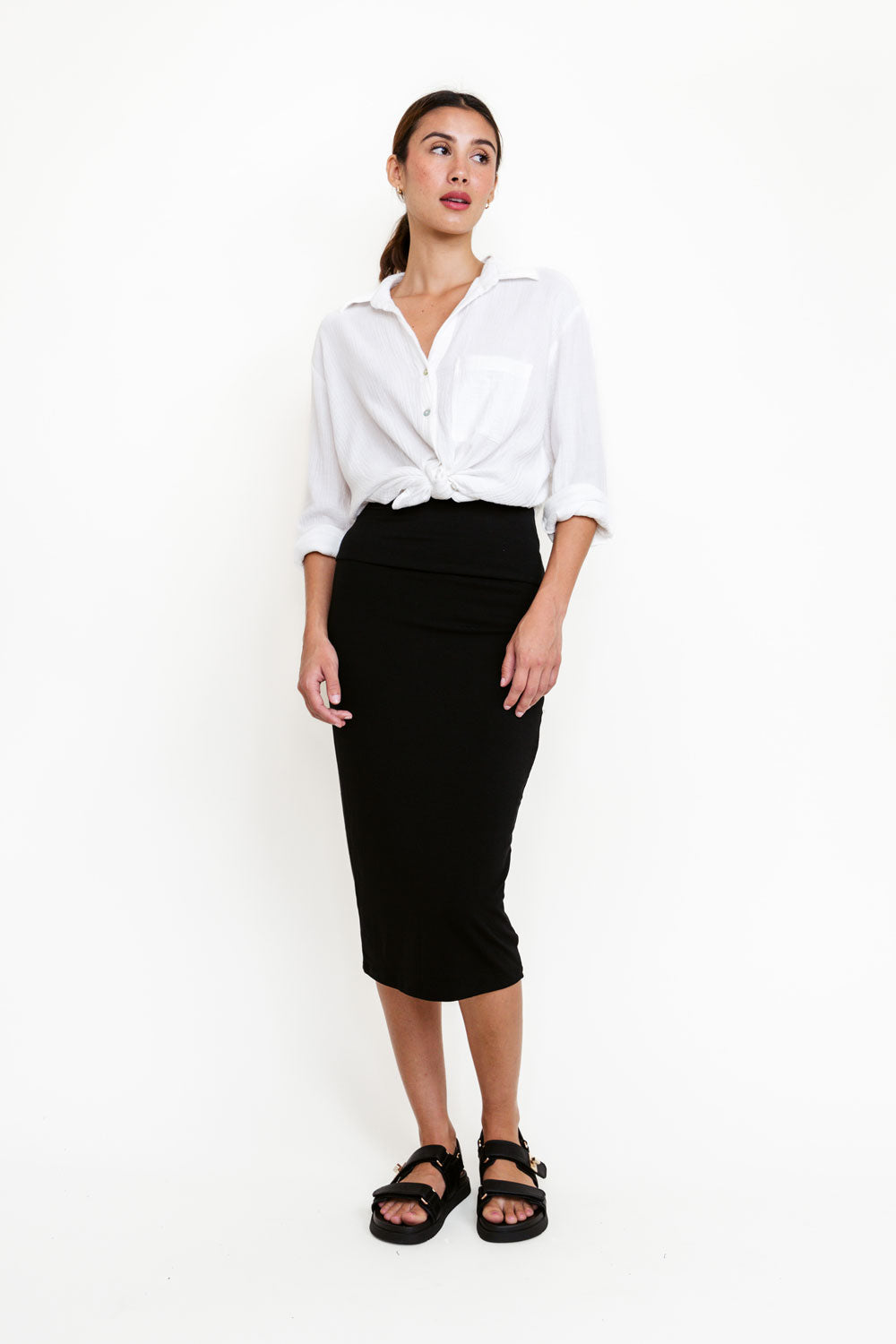 The most comfy pencil skirt you'll own. Skirt Zulu is fitted throughout and featured in our signature jersey fabric.