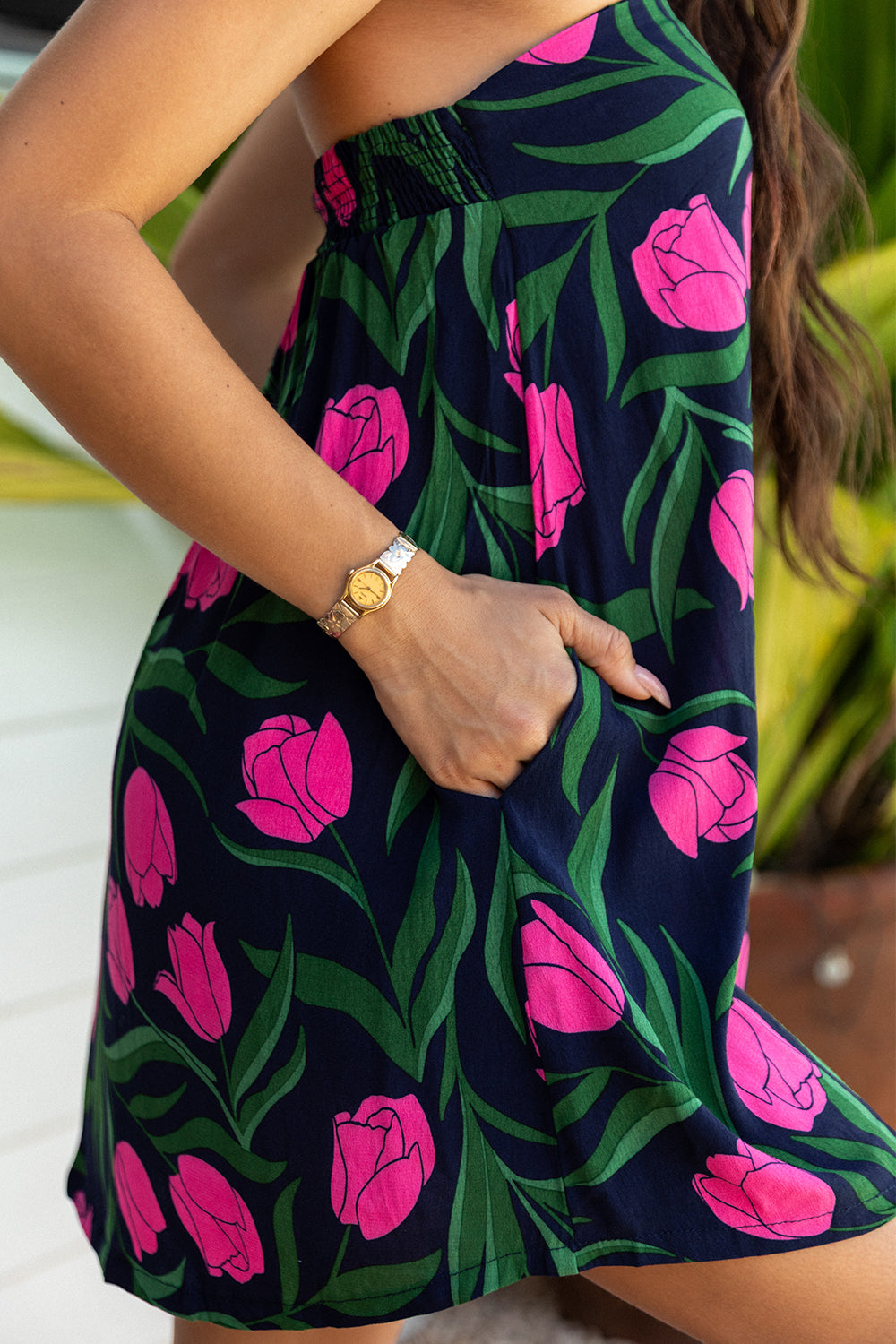 Short strapless shift dress with elastic back and silicone band around bust.