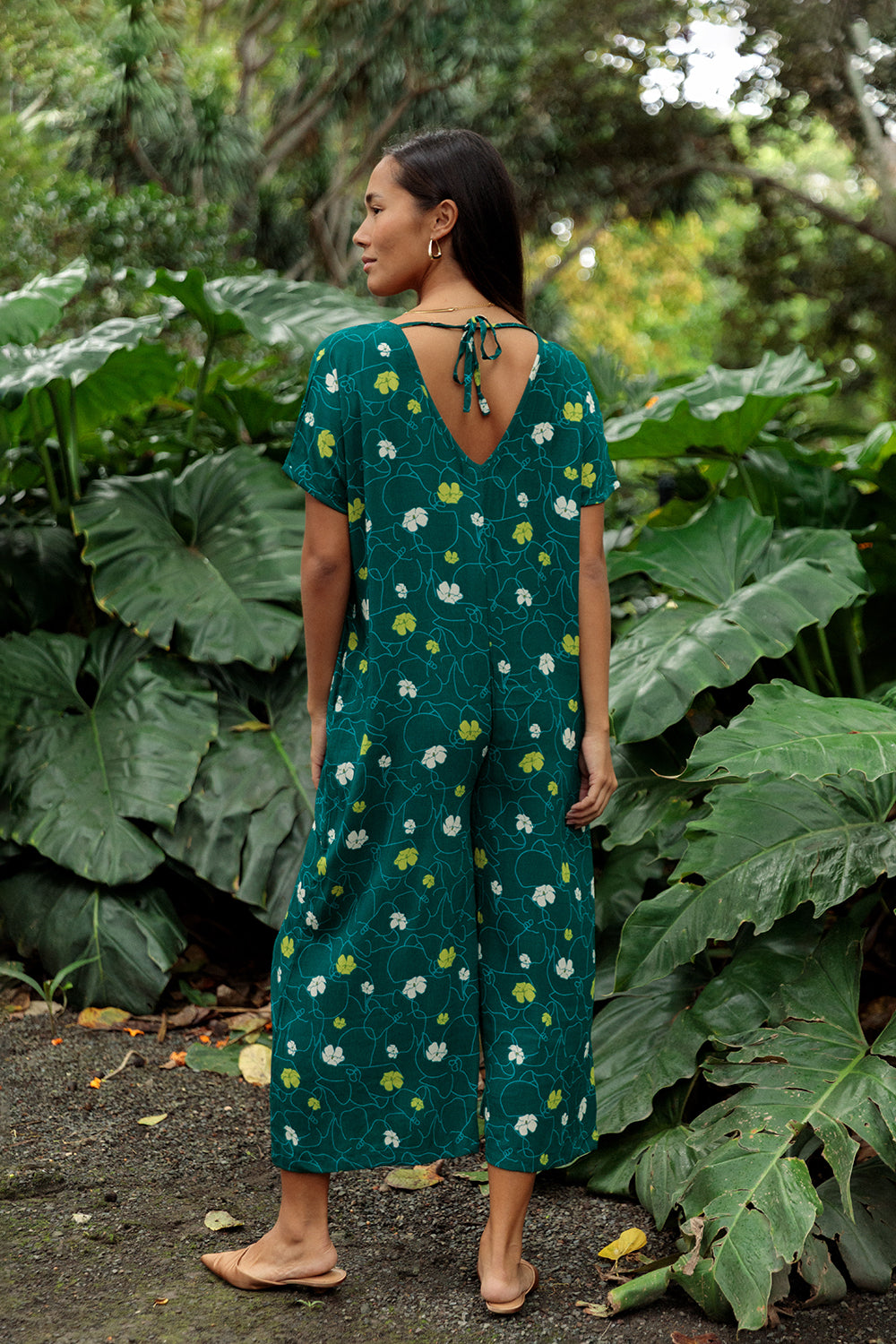 Loose fitting jumper with V neck, tie detail at back opening, and button loop detail at pant hem.