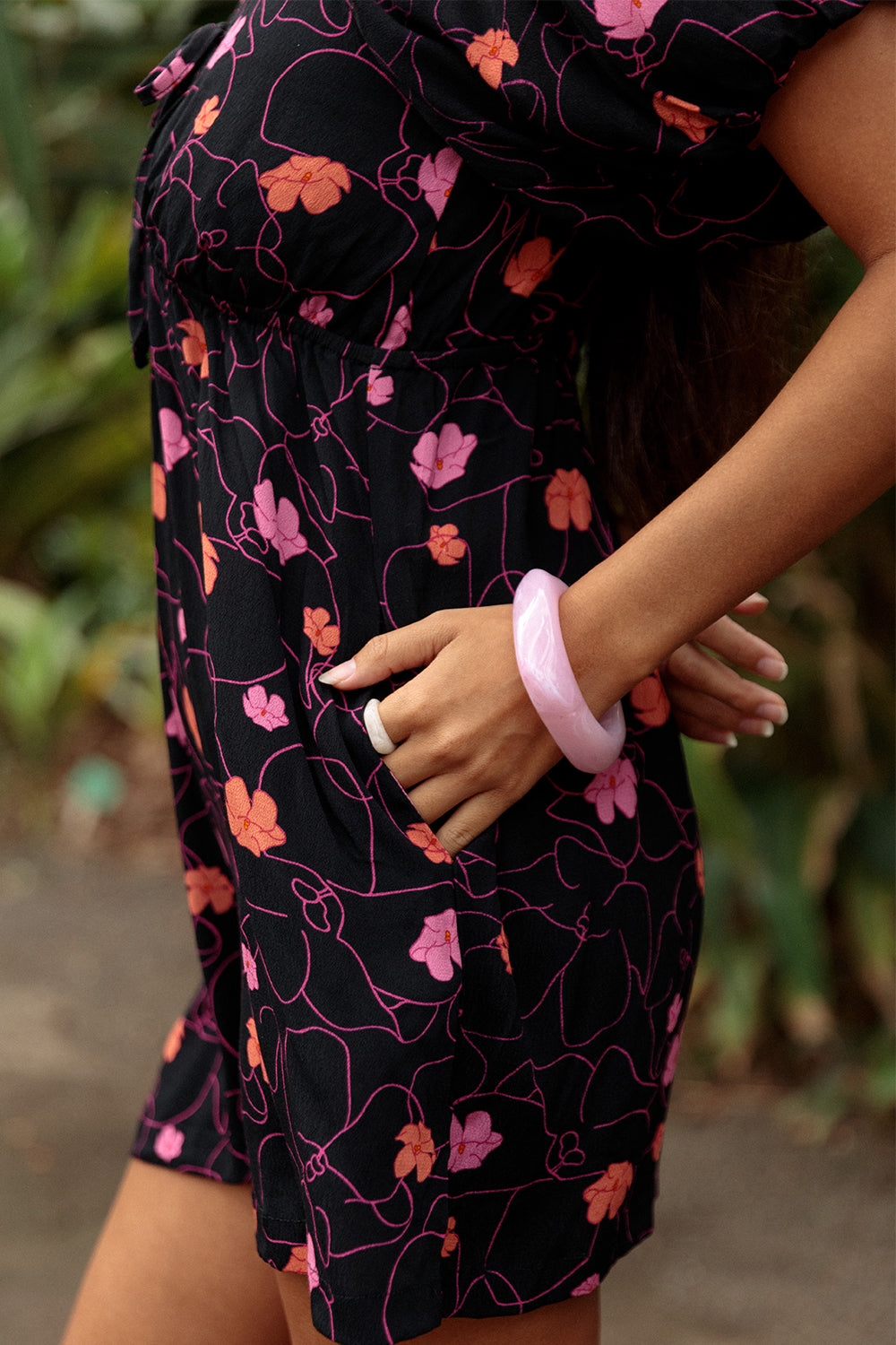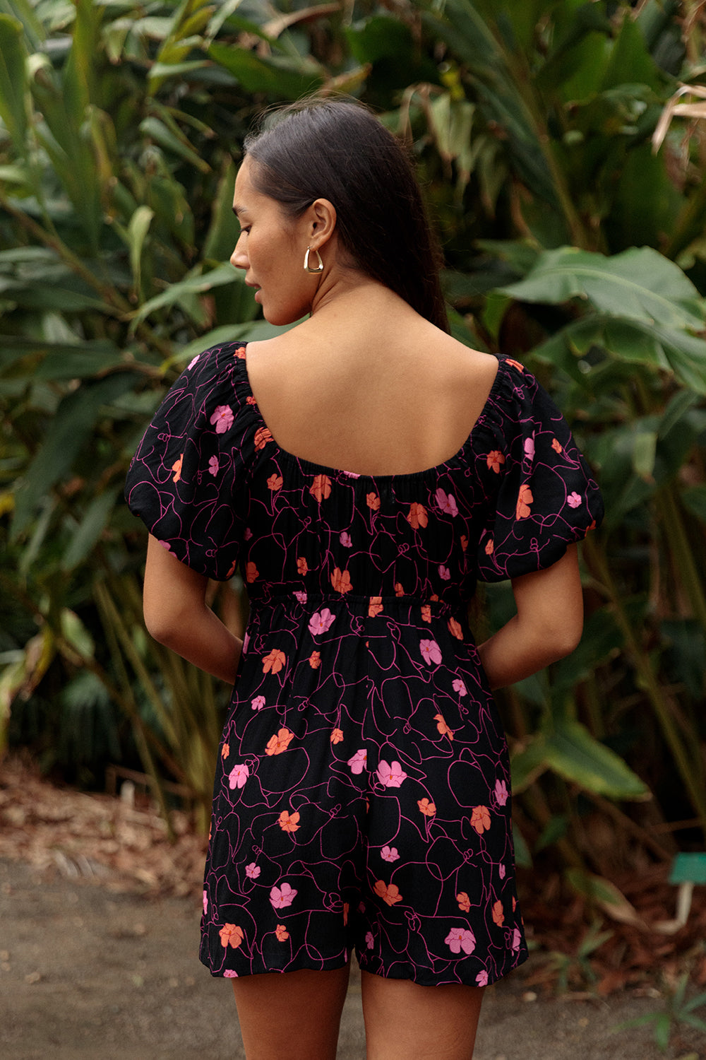 Romper Benny is a woven romper with a short puff sleeve, a flattering V-neckline, and subtle gathering detail at the front bodice.