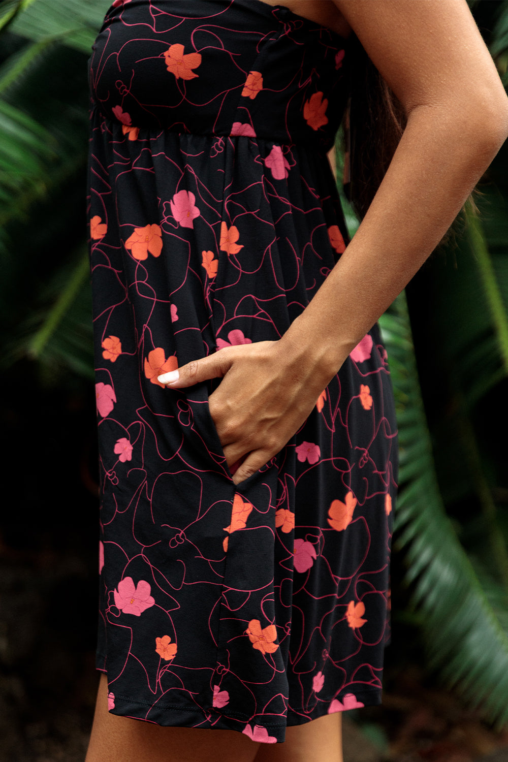 Strapless romper with sweetheart neckline, pockets, and flowy shorts