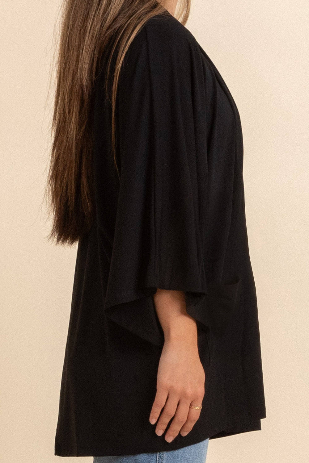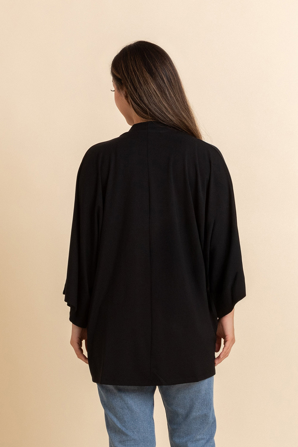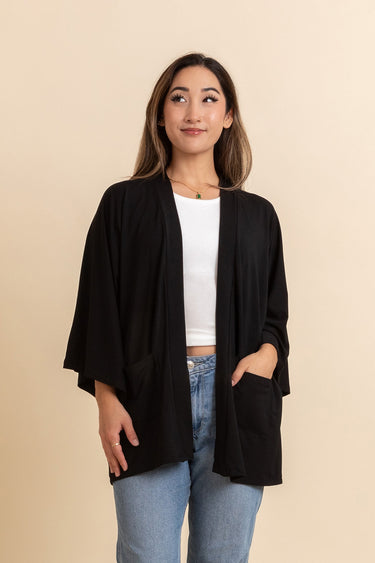 Cardigan Asami is a kimono-style cover-up featuring cozy patch pockets at the front. Perfect for layering over any outfit, this cardigan adds a relaxed yet stylish touch to your everyday look.