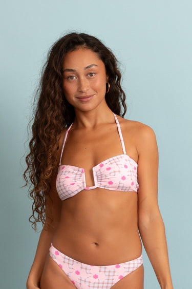 This bandeau top features a square U-ring at the center and a tie-back closure for an adjustable fit. Comes with removable, adjustable straps and removable padding for customizable support and coverage. Wear it your way—strapless or as a halter.
