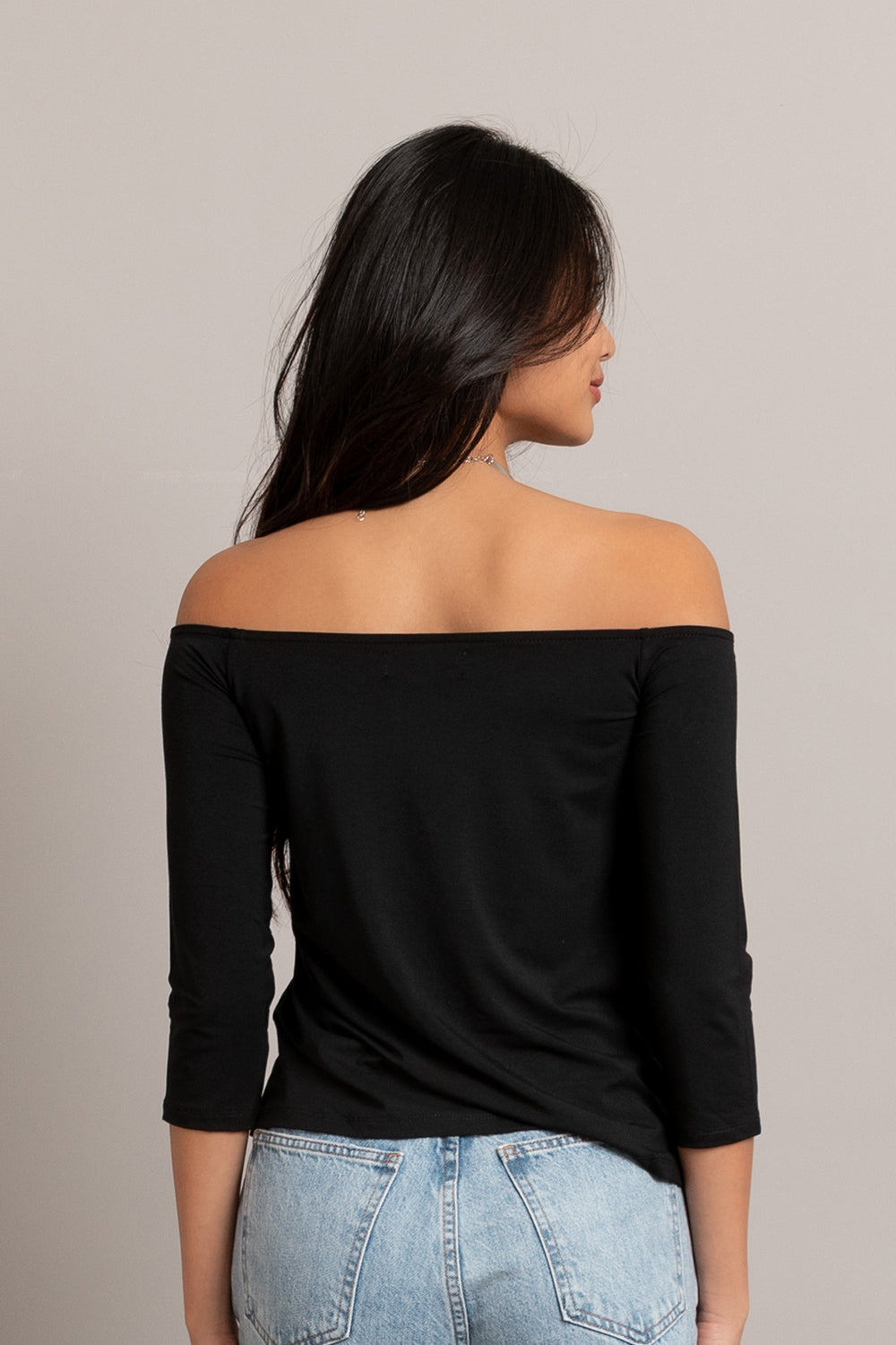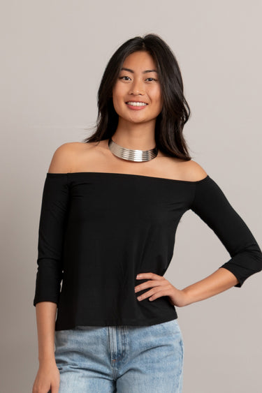 This style features an off shoulder neckline, 3/4 fitted sleeves, and just enough room in the body. A must have for every closet.