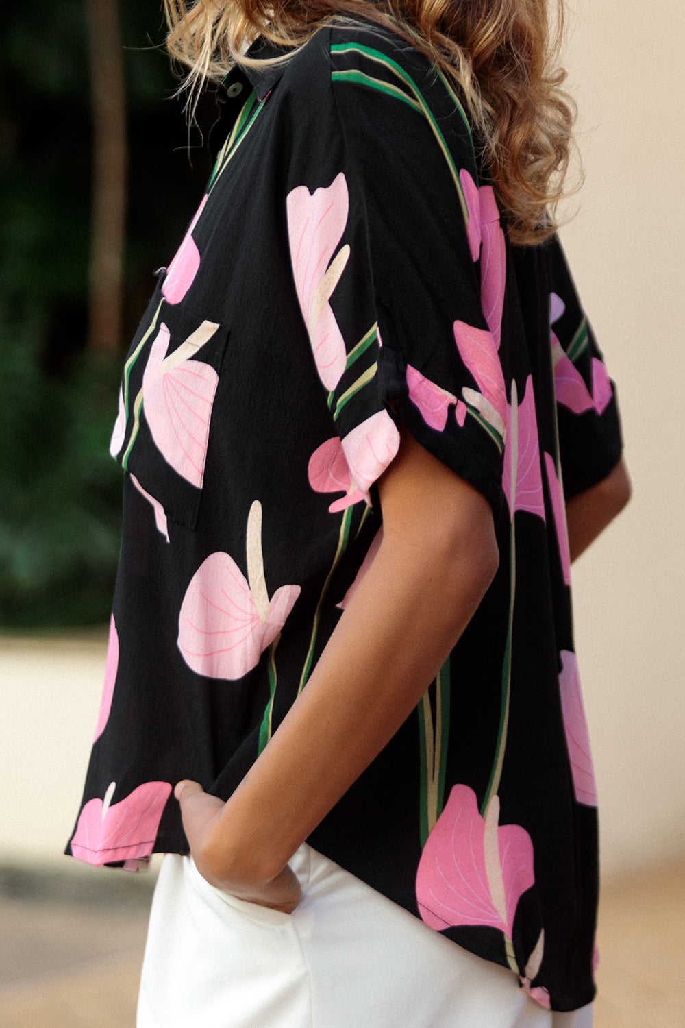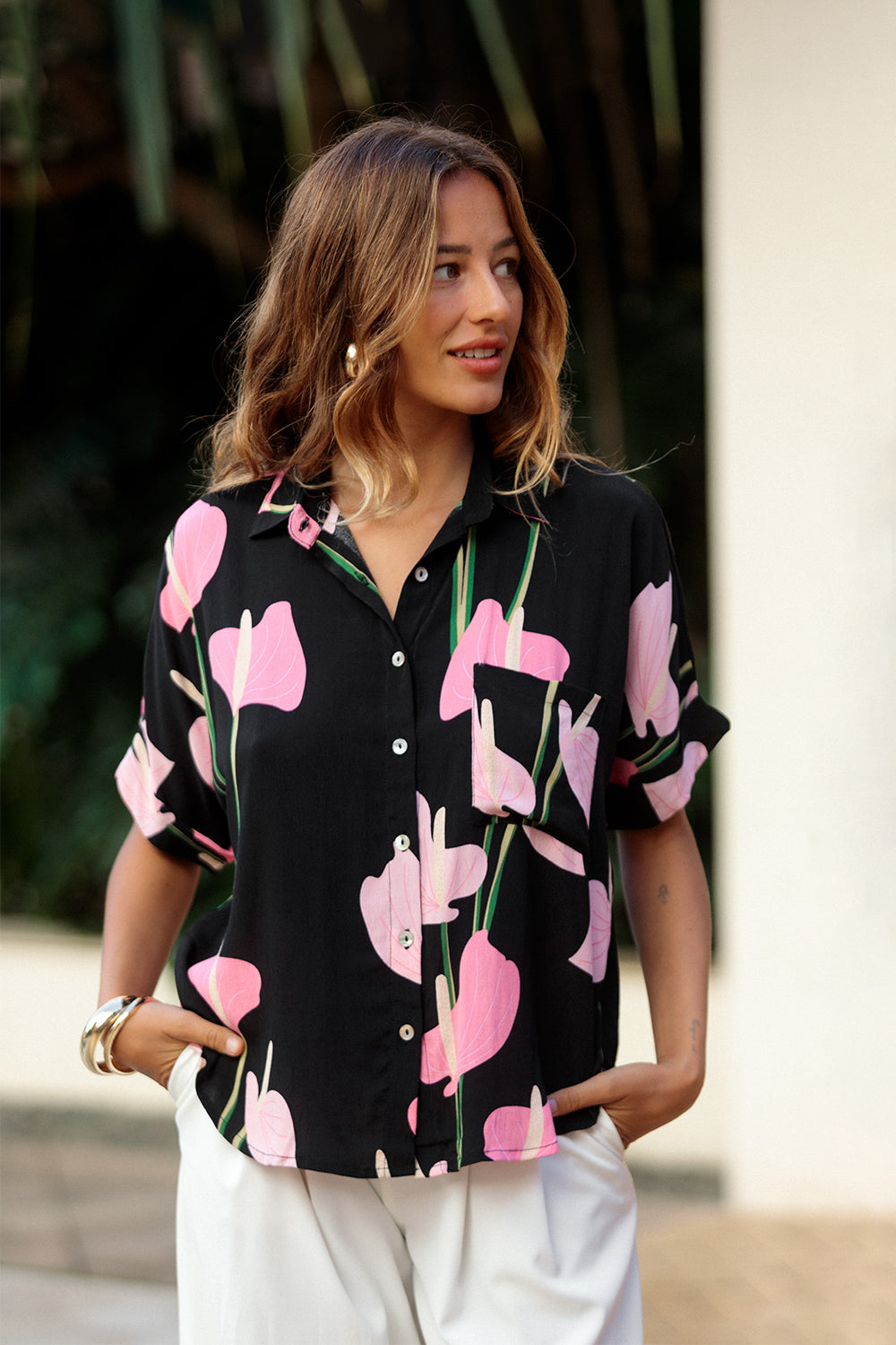 A button up top featuring a boxy/flowy fit, chest pocket, and cuffed sleeves