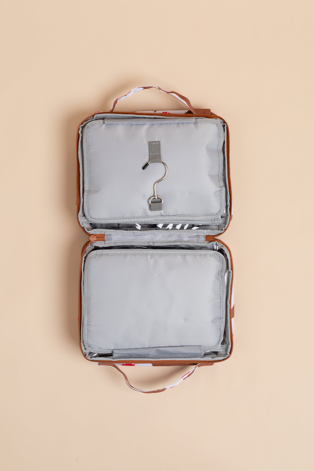- Features a zipper closure with handles, 1 outer zipper at back, 4 inner compartments with zipper closures, and a swivel hook to easily hang on a towel rack or cabinet handle.