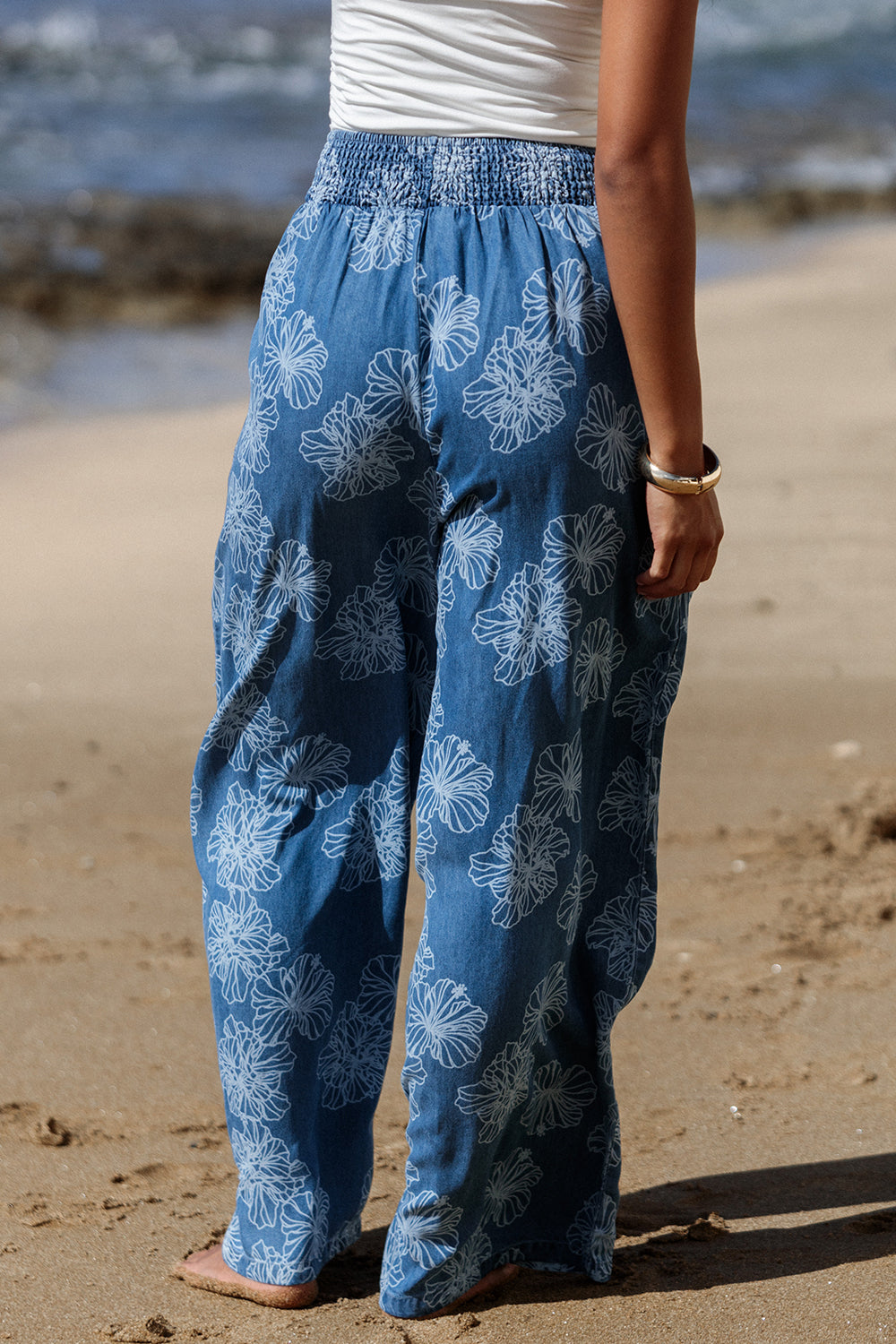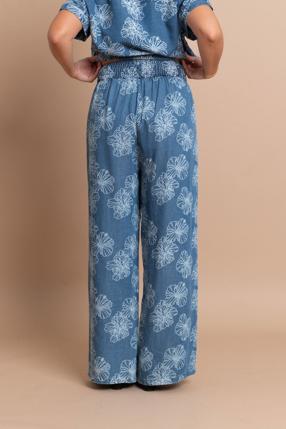 These wide-leg trousers feature a flowy silhouette and a relaxed fit, perfect for keeping you cool and comfortable all day long. The fully smocked, high-rise waistband offers a flexible fit and easy pull-on function, making them an ideal choice for any casual outing or getaway.