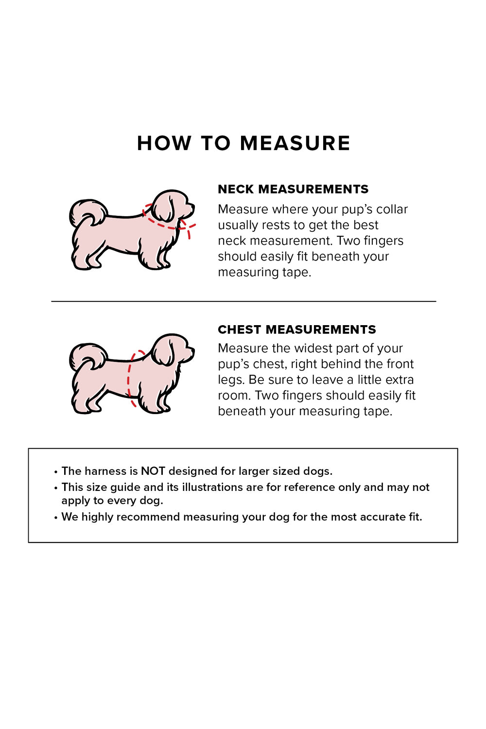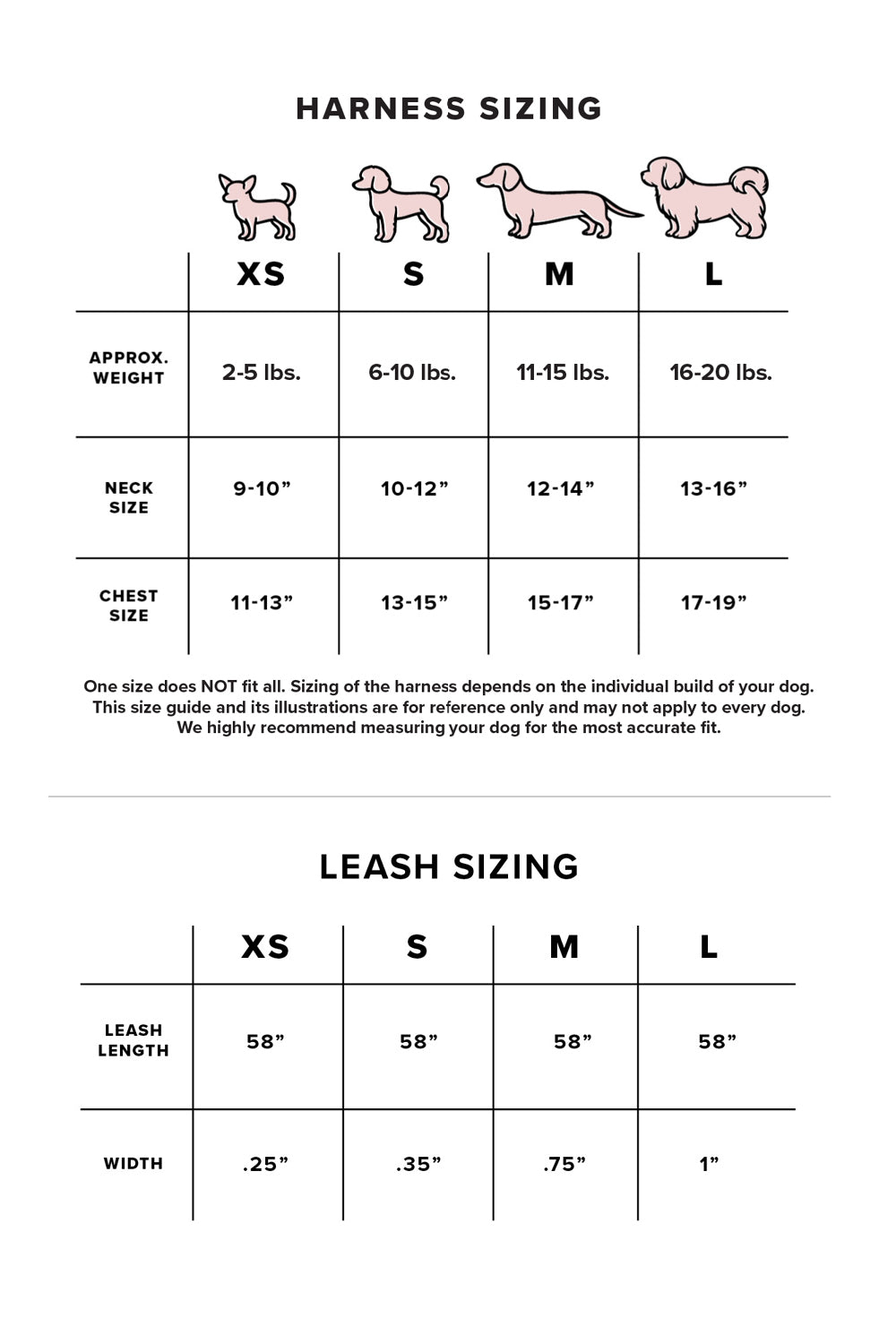 One size does NOT fit all. Sizing of the harness depends on the individual build of your dog. Our size guide and its illustrations are for reference only and may not apply to every dog. We highly recommend measuring your dog for the most accurate fit.