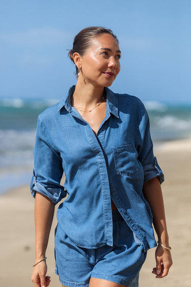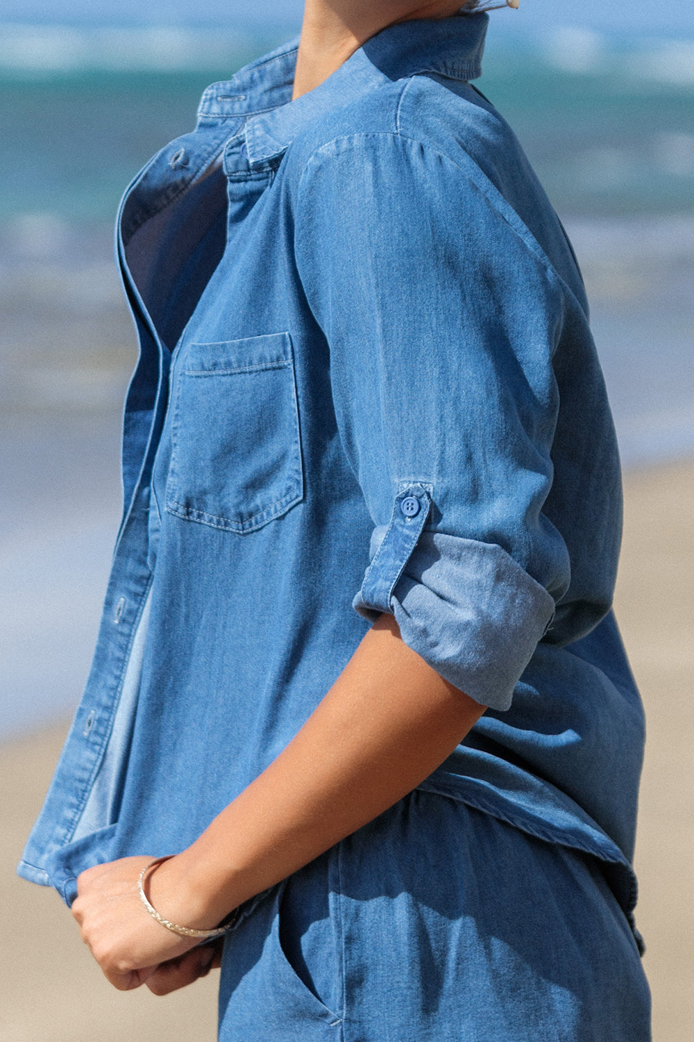 This button-up shirt is relaxed and comfortable fit, making it perfect for layering or wearing on its own. Key features include a classic collar, a full button-front, a convenient front pocket at the chest, and long sleeves designed to be rolled up for an effortlessly chic look.